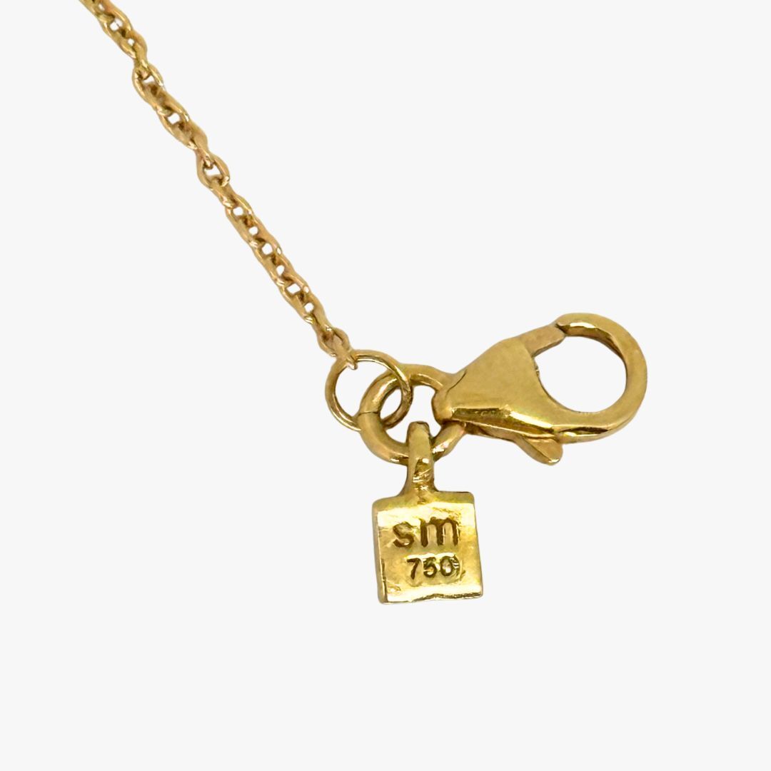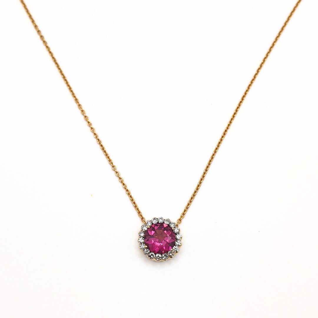 Pendentif Beirut Colours Selim Mouzannar d’occasion en or rose 750/1000 (18K). Ce pendentif présente un motif rond de 9 mm de diamètre, avec au centre une rhodolite entourée de 18 diamants taille brillant qui illuminent la pierre. Le tout est suspendu à une chaîne en maille forçat en or rose. Bijou signé Selim Mouzannar.