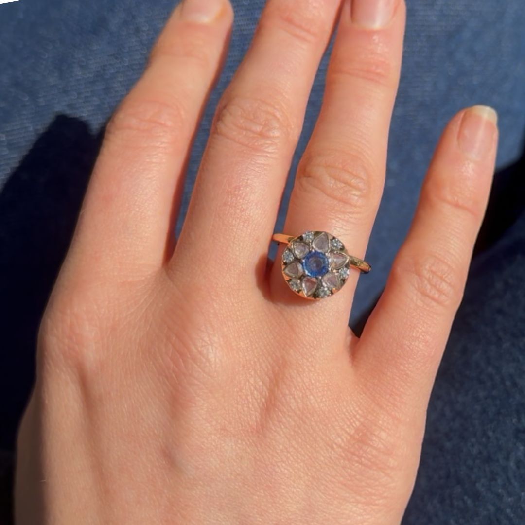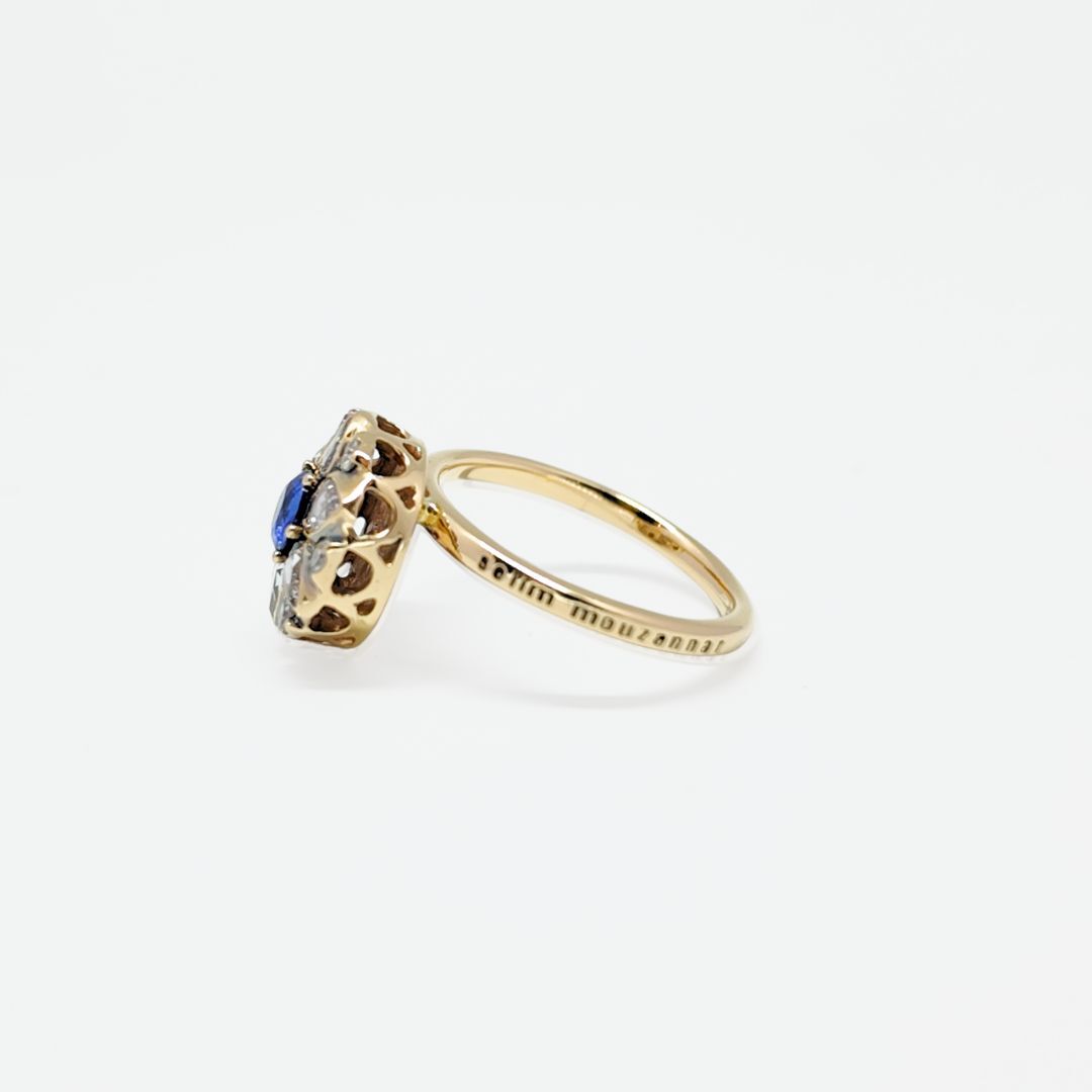 Bague Beirut Rosace Selim Mouzannar d’occasion en or rose 750/1000 (18K). Cette bague présente un motif rond de 13 mm de diamètre, sur un anneau en or rose, avec au centre un saphir bleu entourée d’une rosace de 16 diamants qui illuminent la pierre. Tour de doigt : 51. Bijou signé Selim Mouzannar.