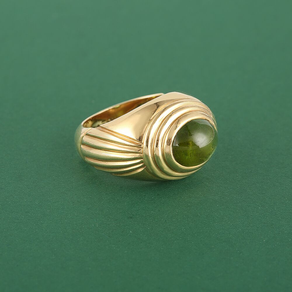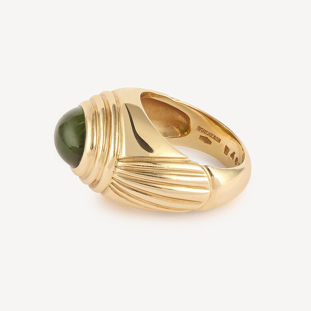 Bague Parfum Boucheron d’occasion en or jaune 750/1000 (18K) avec au centre d’un jonc important, une tourmaline verte en cabochon pain de sucre dans un triple entourage de godrons. Bague Boucheron de seconde main signée et numérotée, vendue avec son écrin d’origine, et certificat d’authenticité Boucheron.