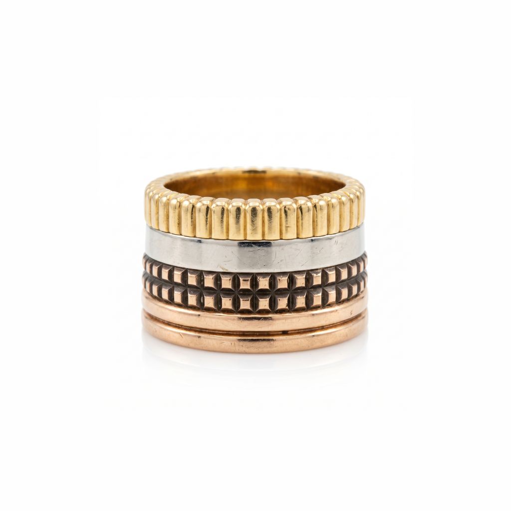 Bague Quatre Classique Large Boucheron d’occasion, en or jaune, or rose et or blanc 750/1000 (18K), et PVD (or chocolat). La bague jonc est composée de quatre joncs soudés texturés en PVD : un jonc en or jaune stylisant le « gros grain », un jonc en or blanc lisse, un jonc en PVD « clous de Paris » et enfin un jonc en or rose à double godrons. Les 4 anneaux superposés formant un jonc large d’environ 1,1 cm de hauteur. Tour de doigt : 50. Bijou signé Boucheron.