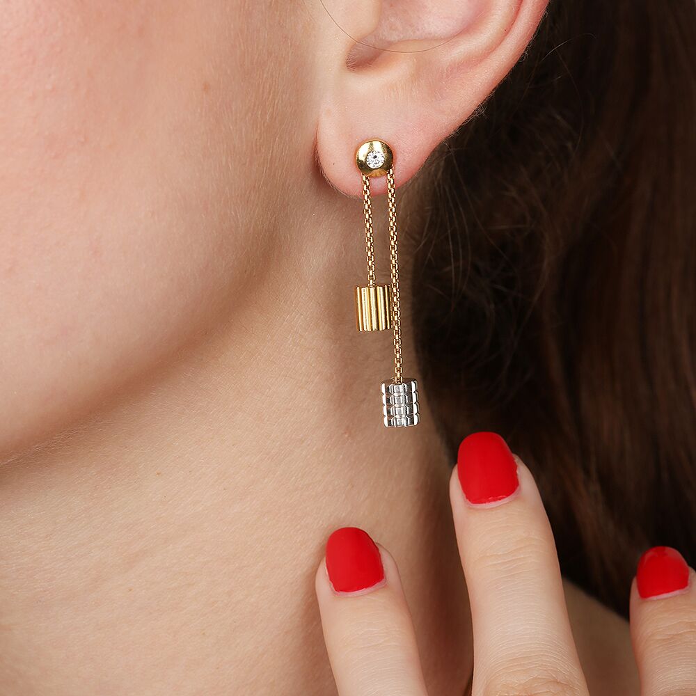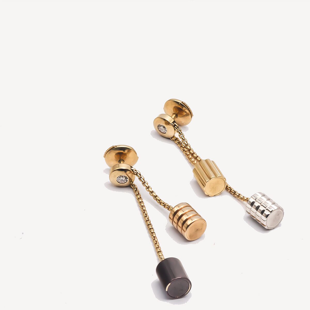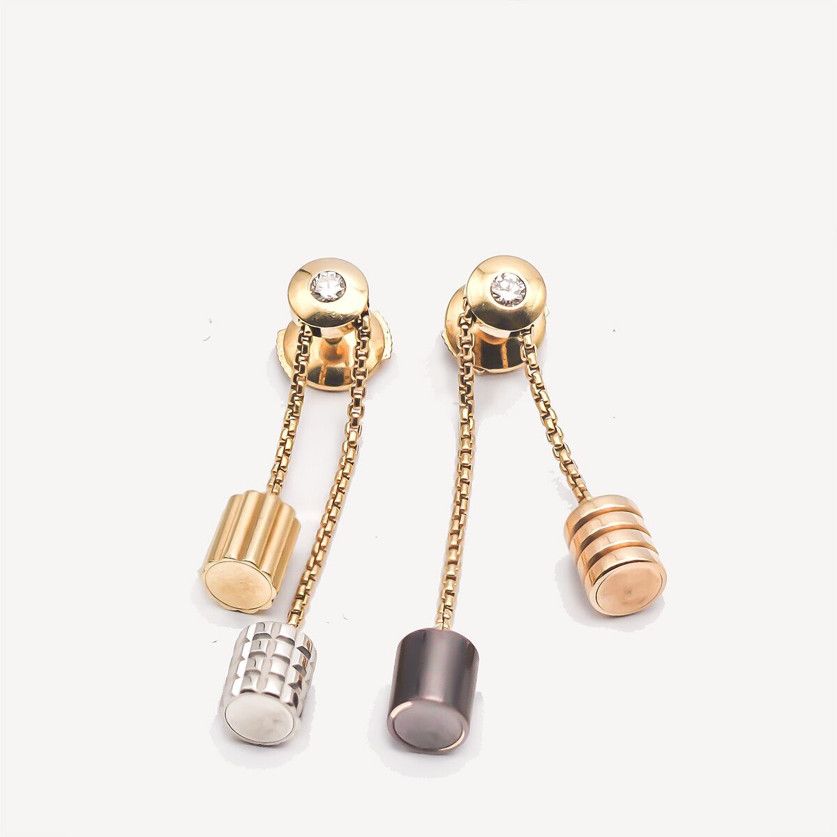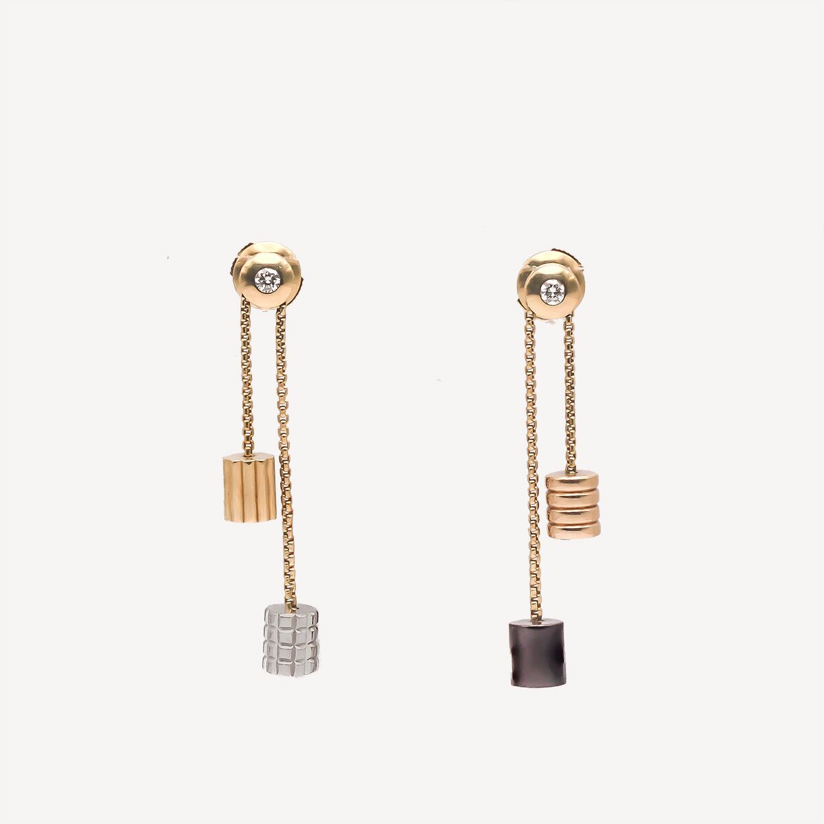 Paire de boucles d’oreilles Quatre de Boucheron en or jaune, en or rose, en or blanc, et en or chocolat.. Chaque pendant est composé d’une puce en or jaune habillé d’un diamant de taille brillant, à la quelle est attachée deux fines chaînes fantaisies terminées chacune par deux cylindres texturés en or jaune, or rose, or blanc et or chocolat : L’une avec un cylindre en or rose à motifs de godrons et un cylindre en or PVD chocolat lisse. L’autre avec un cylindre en or jaune à grosgrain et un cylindre en or blanc à pointes de diamants. Des boucles d’oreilles de seconde main trés féminines et iconiques de la marque Boucheron.