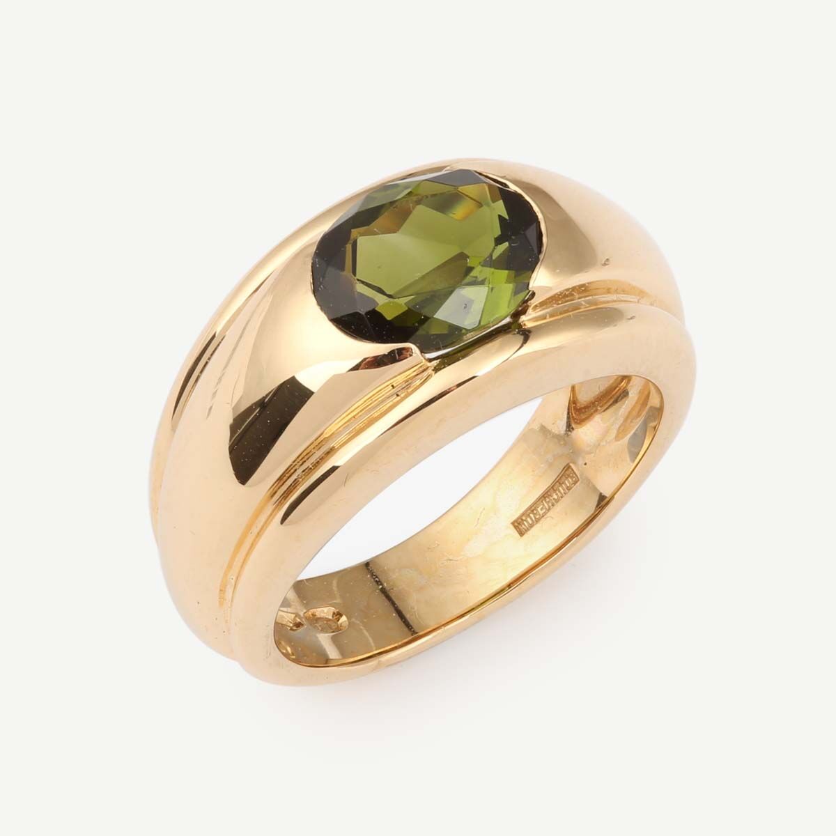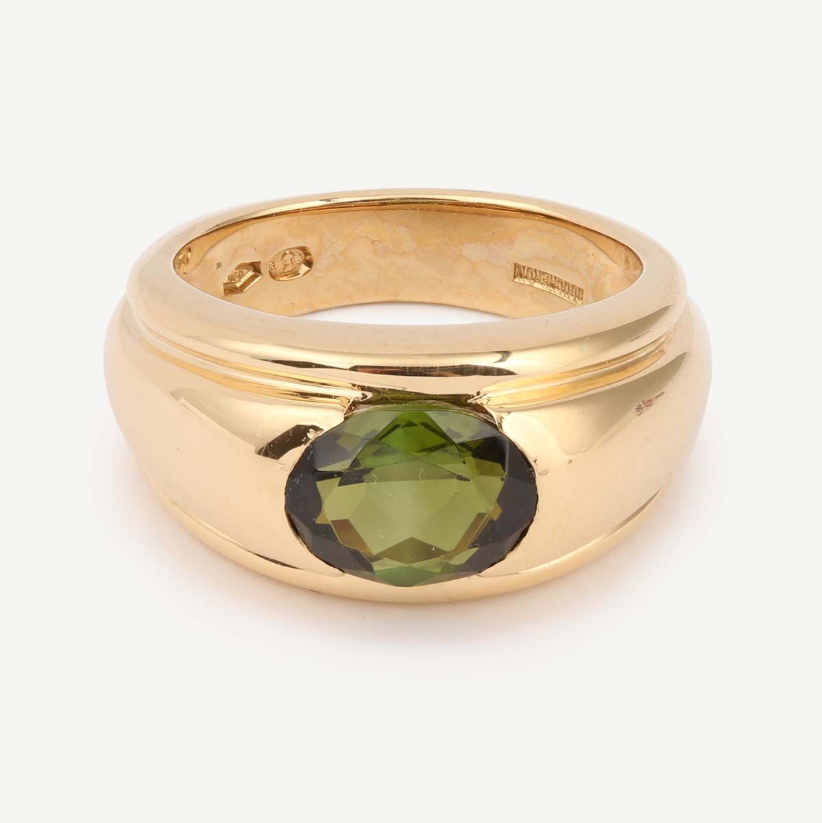 Bague Roxane Boucheron de seconde main en or jaune 18 carats (750/1000). Bague Jonc présentant une Tourmaline verte foncée en demi serti clos sur un jonc légèrement bombé.