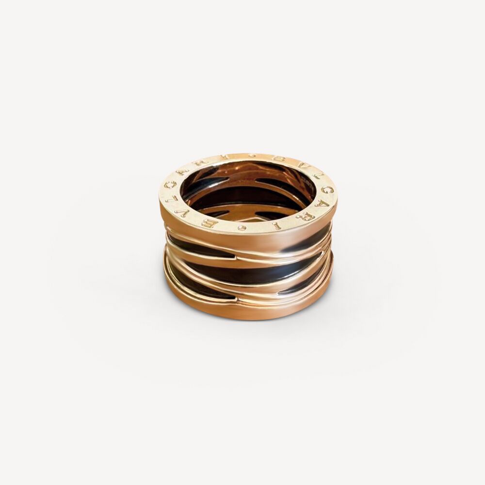 Bague B.Zero1 Bulgari d’occasion en or rose 750/1000 (18K). Anneau large mesurant environ 12 mm de largeur, décoré d’un motif en forme de spirale cylindrique sur un anneau large de céramique. La signature Bulgari apparait des deux côtés du motif. La bague est présentée avec son écrin d’origine.