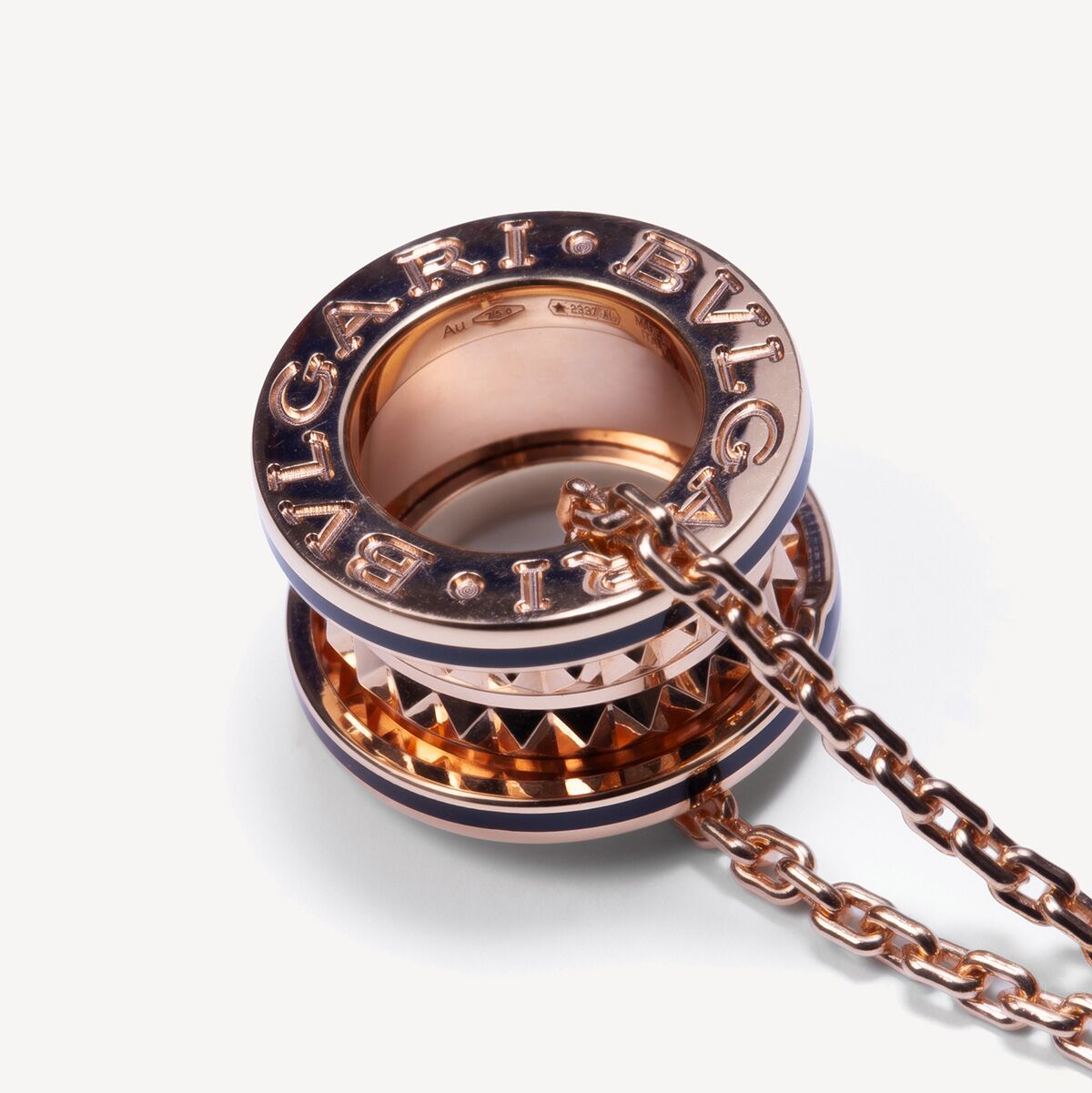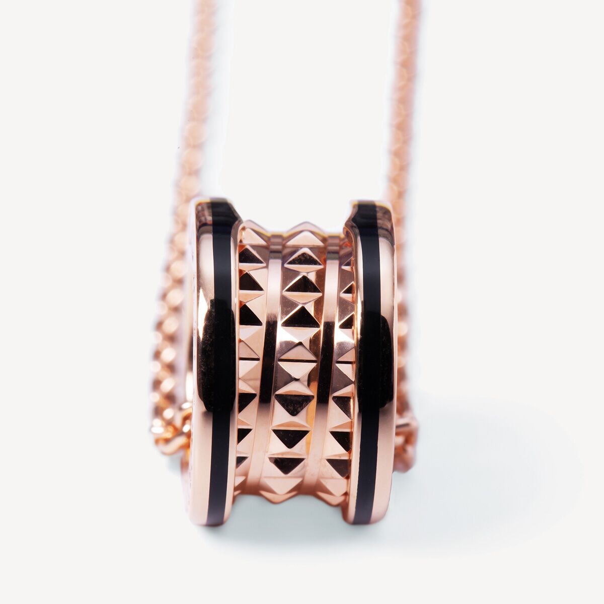 Pendentif B.Zero 1 Bulgari d’occasion en forme d’anneau large décoré d’une spirale cloutée avec des inserts en céramique noire sur les bords, signé Bulgari sur le côté et amovible, sur une chaîne de 45 cm dans l’esprit de la maille forçat. Fermoir mousqueton. Attache facile sur la chaîne (et non dans l’anneau) et réglable avec 2 anneaux de raccourcissement à 3 cm.