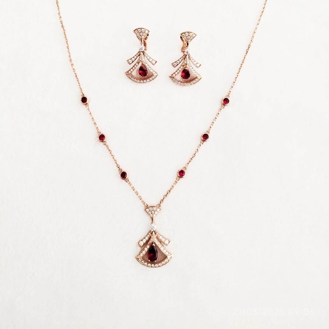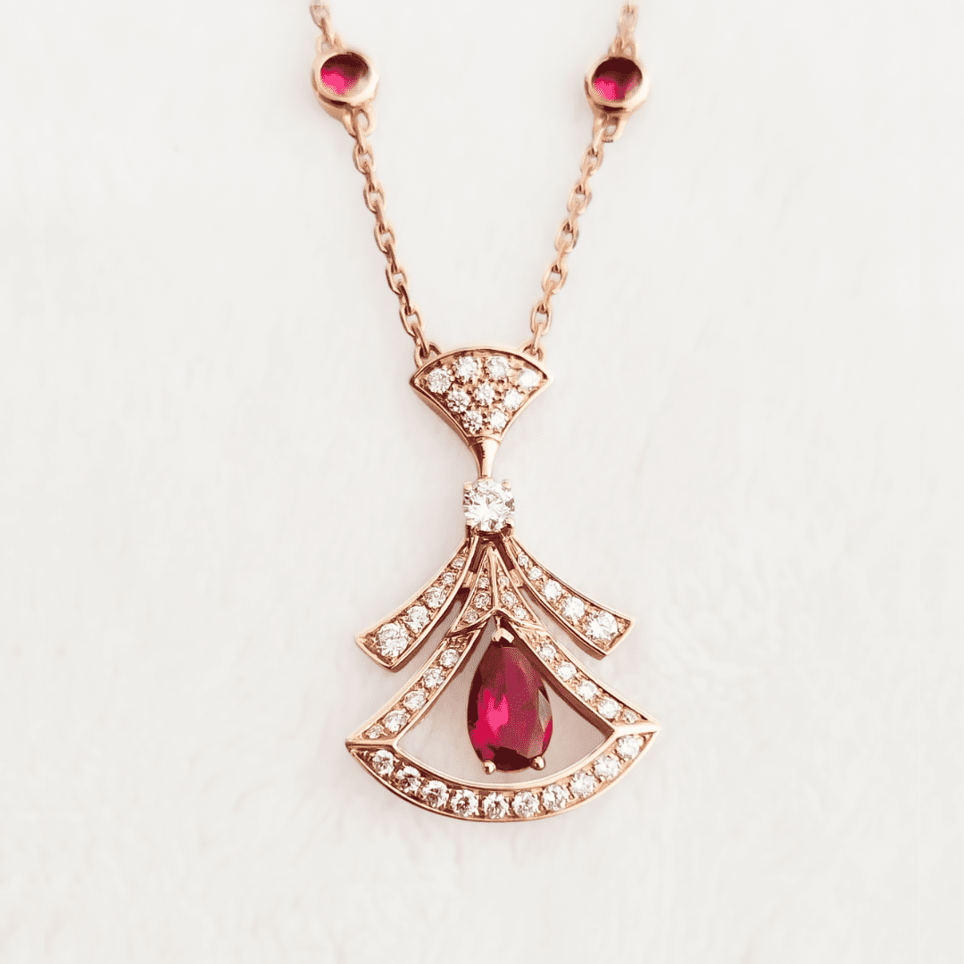 Collier Diva’s Dream Bulgari d’occasion en Or Rose 750/1000 (18K) serti de rubis et diamants. Le collier présente un motif en éventail ajouré, typique de la collection Diva’s Dream, et est serti d’un rubis rond taille brillant et d’un diamant rond taille brillant avec pavage de diamants. Hauteur du motif : environ 3,3 cm. Bijou Bulgari signé et authentifié.