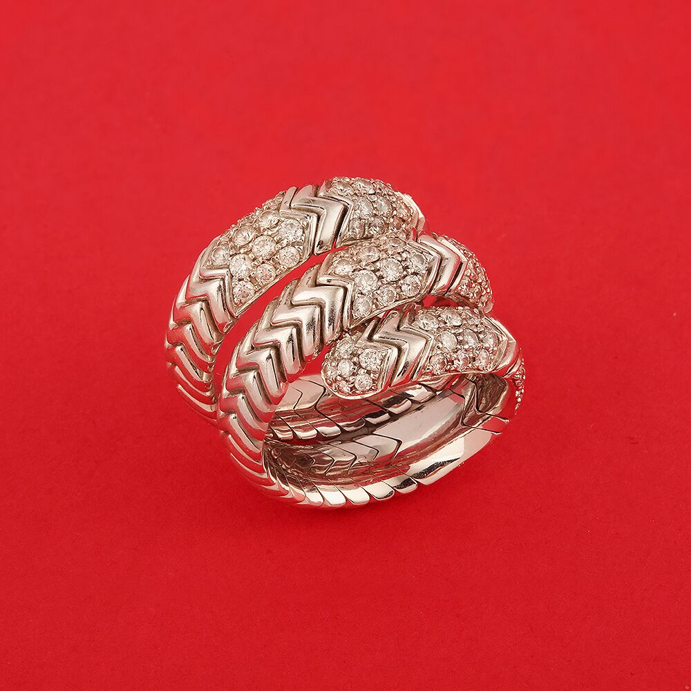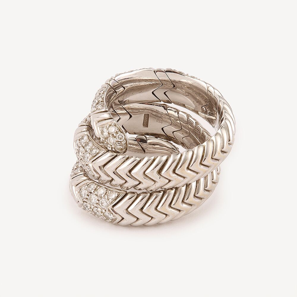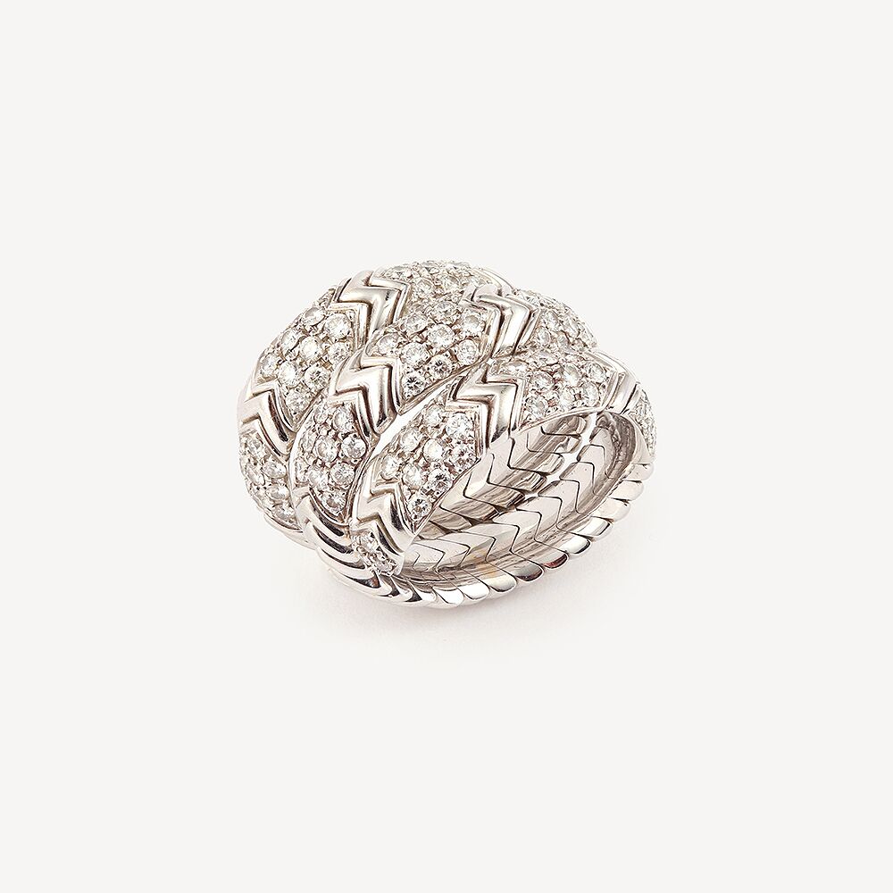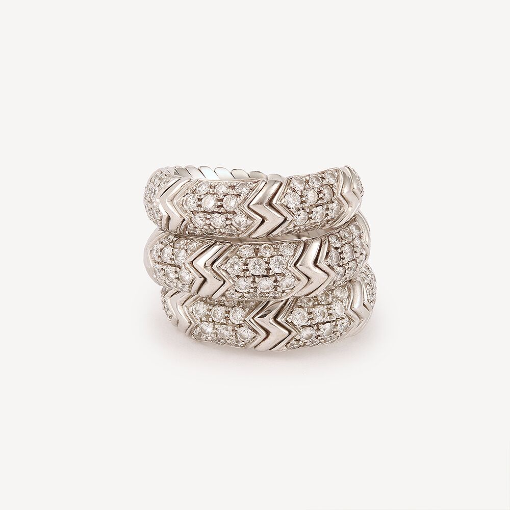 Bague Bulgari Spiga à 3 tours en or blanc et diamants, composée d’un anneau en spirale godronné, ornée sur le dessus d’un pavage en diamants de taille brillants.