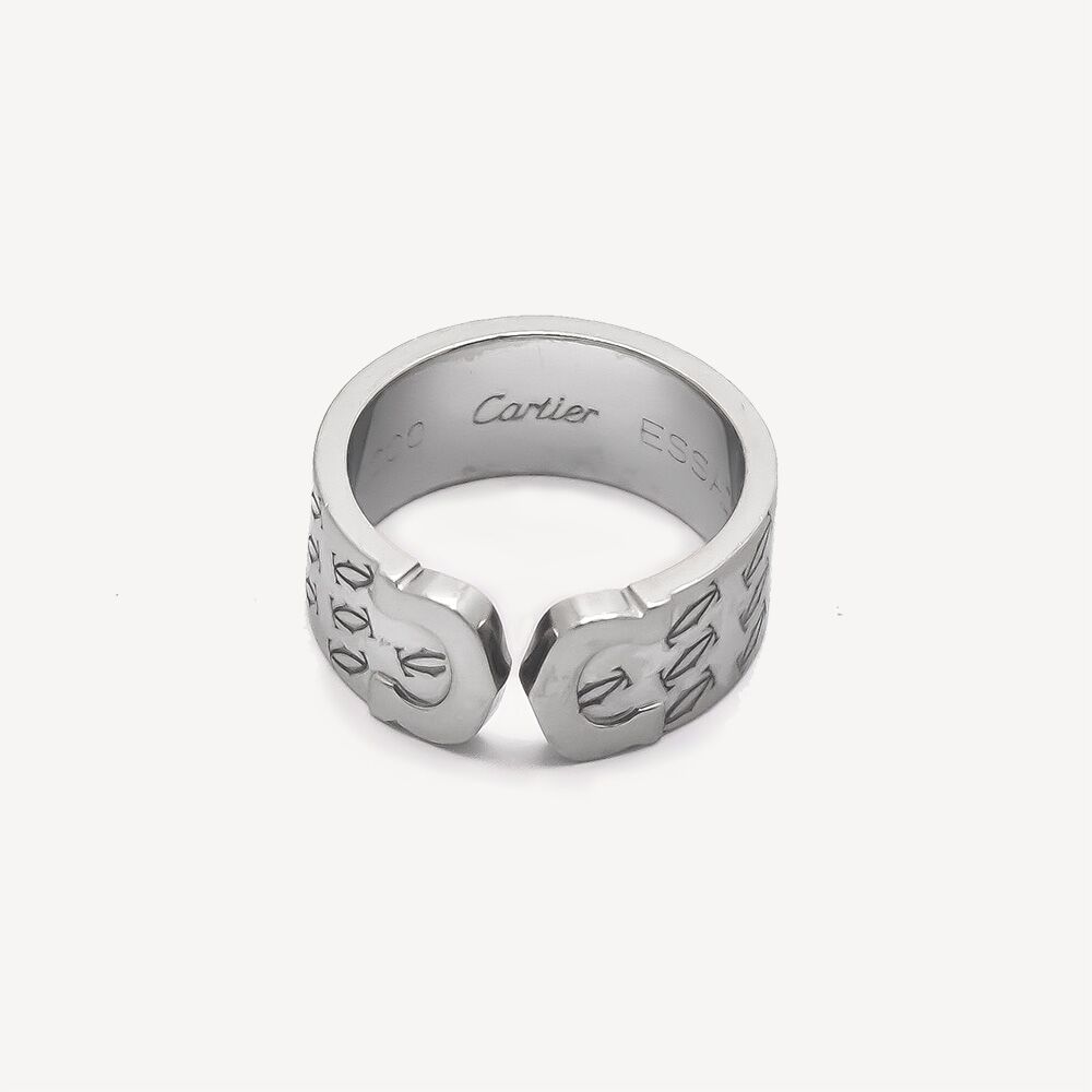 Bague Double C Cartier d’occasion en or blanc 750/1000 (18K). Une bague figurant un large bandeau ouvert dont les extrémités sont siglées du logo de la maison Cartier et ainsi terminées par des « C ». L’anneau est gravé de plusieurs motifs C réguliers et géométriques.