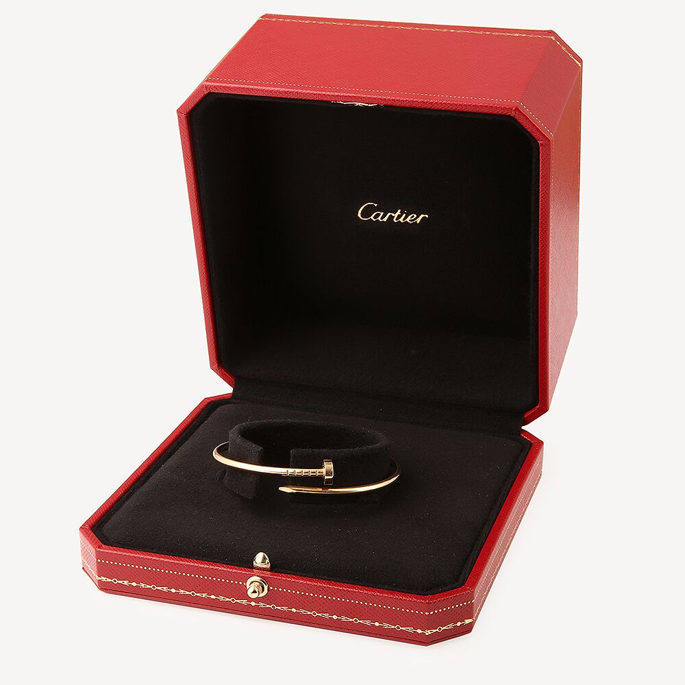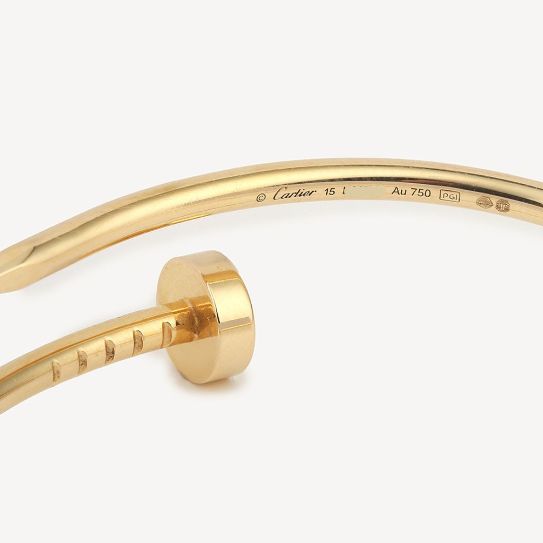 Cartier d’occasion en or jaune 750/1000 (18K). Petit Modèle. Le bracelet arbore un design en forme de clou qui s’enroule élégamment autour du poignet. Etat neuf, avec boîte et certificat. Taille 15. Cette version est la version Petit Modèle, plus fine que l’originale.