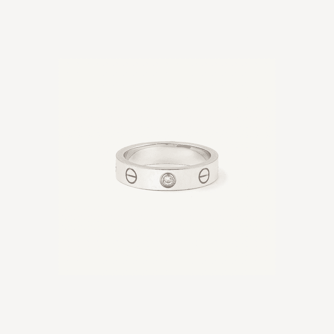 Bague Love PM Diamant Cartier d’occasion, en or blanc 750/1000 (18K). Un anneau de largeur environ 4 mm avec 7 motifs espacés de pas de vis, dont l’un des motifs est serti d’un diamant taille brillant. Signée Cartier et numérotée à l’intérieur.