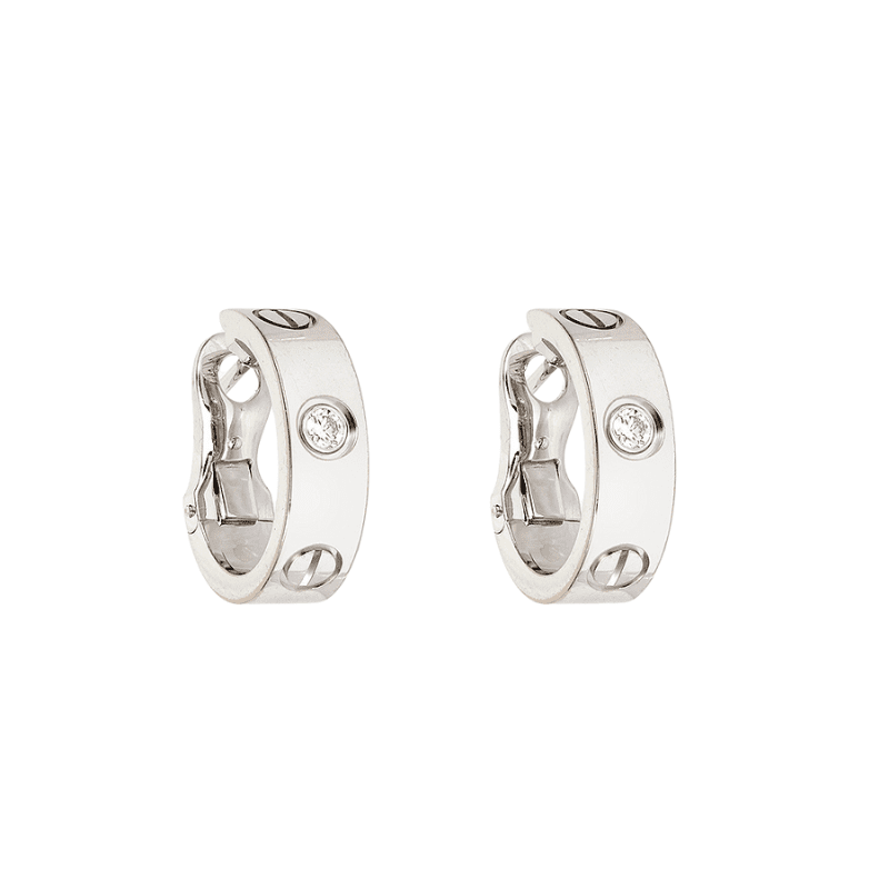Boucle d’oreille créoles Cartier Love de seconde main en en or blanc 18k (750/1000). Moyen modèle. Clips pour oreilles percées avec motifs espacés de pas de vis, dont l’un est un diamant taille brillant. Signée Cartier et numérotées.