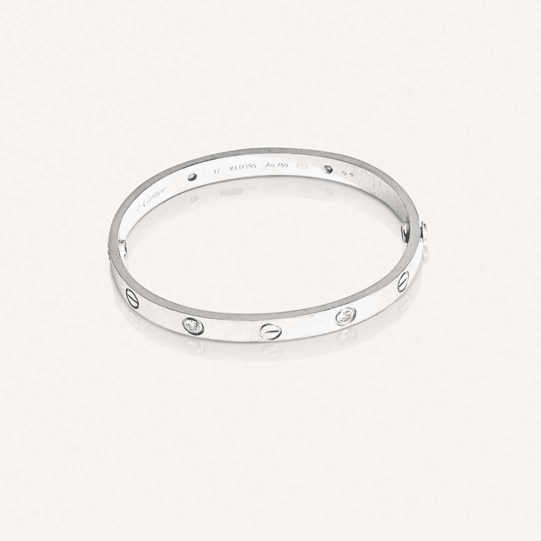 Bracelet Love Cartier d’occasion en or gris 750/1000 (18K) avec 4 diamants. Un jonc ovale, composé de deux arcs rigides attachés par une vis avec motif de pas de vis espacés. Le système de fermeture est constitué de deux vis fonctionnelles situées de part et d’autre du bracelet à ouvrir et fermer avec le tournevis. Conseil de taille : Choisissez une taille de 1 cm de plus que le tour de votre poignet pour un porté ajusté ou de 2 cm pour un porté plus large.
