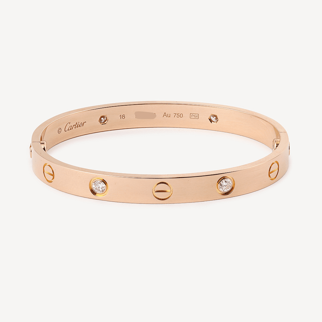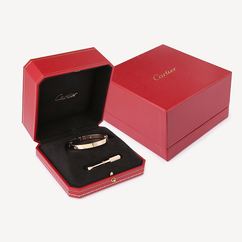 Bracelet Love Cartier d’occasion en or rose 750/1000 (18K) avec 4 diamants. Un jonc ovale, composé de deux arcs rigides attachés par une vis avec motif de pas de vis espacés. Le système de fermeture est constitué de deux vis fonctionnelles situées de part et d’autre du bracelet à ouvrir et fermer avec le tournevis. Conseil de taille : Choisissez une taille de 1 cm de plus que le tour de votre poignet pour un porté ajusté ou de 2 cm pour un porté plus large.