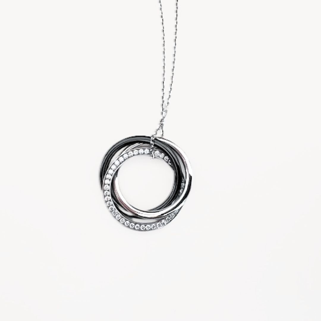 Pendentif Trinity Céramique Cartier de seconde main, composé d’un anneau en or gris 18 carats (750/1000), d’un second serti de diamants taille brillant et d’un dernier en céramique noire. Ce pendentif incarne l’unité et le raffinement.