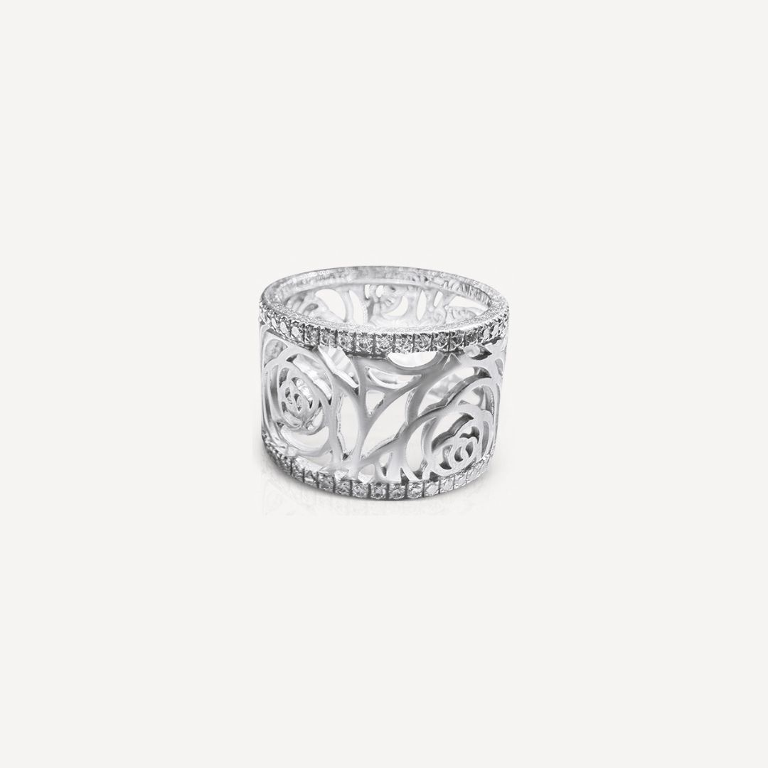 Bague Chanel camélia Fil GM d’occasion, en or blanc 750/1000, avec un bandeau pavé de diamants, taille 50.