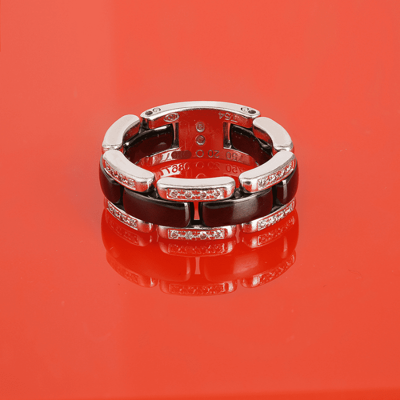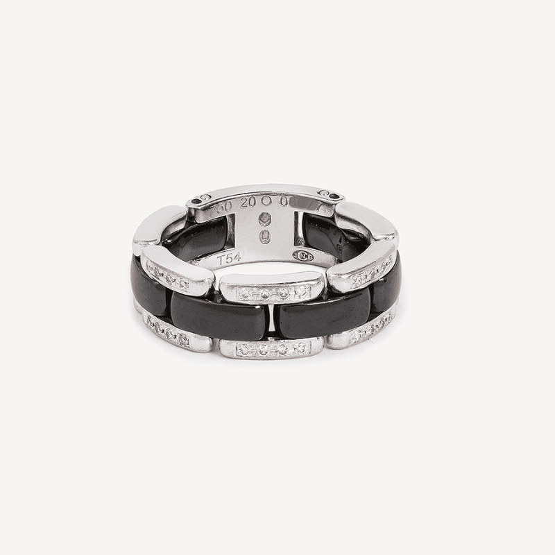 Bague Ultra MM Chanel d’occasion en or blanc 18 carats (750/1000), en céramique noire et en diamants. Une bague signée Chanel souple, et composée d’une ligne de maillons bombés en céramique noire, encadrée par 2 rangs en or blanc serti de diamants.