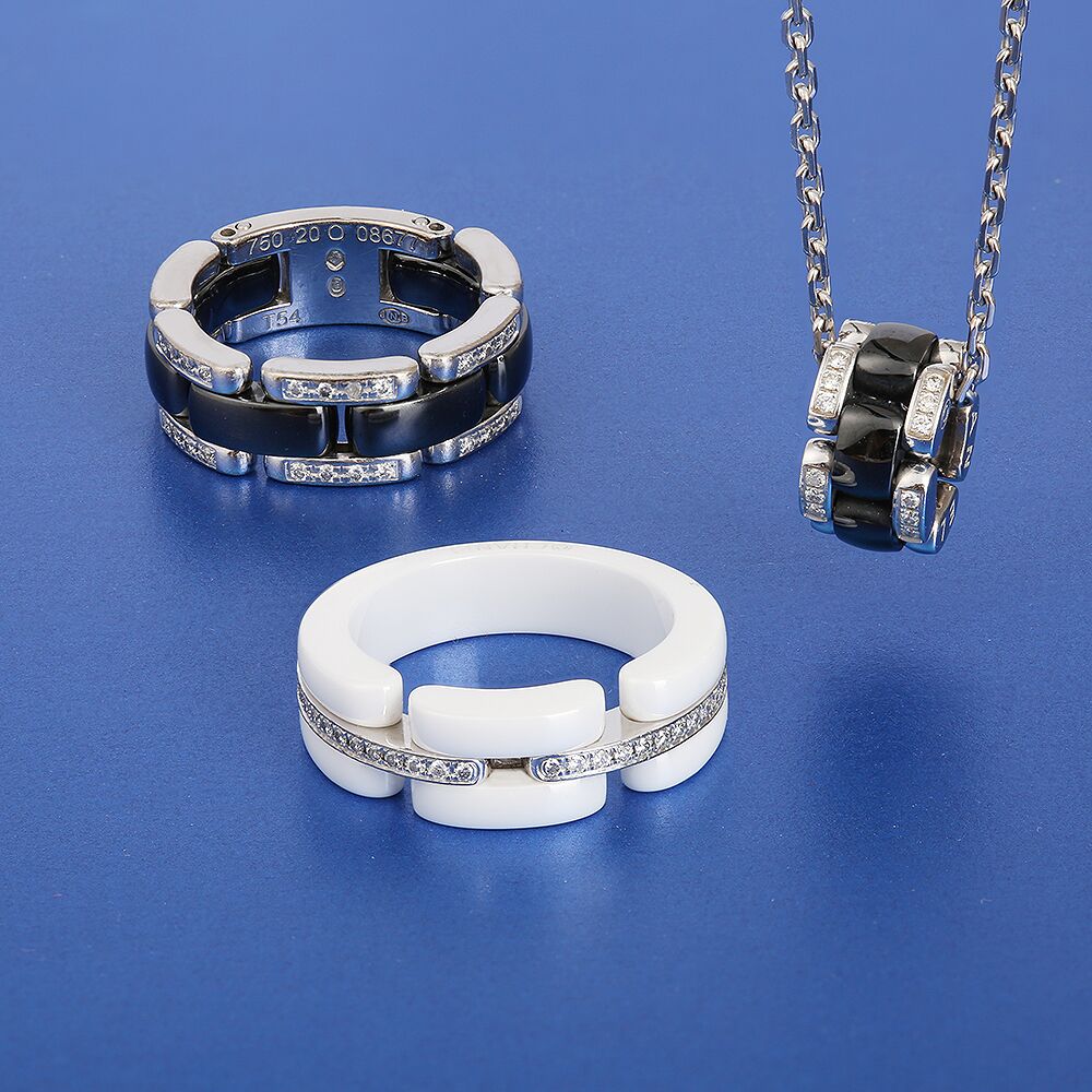 Inspirée de la montre J12, célèbre emblème de la marque Chanel qui a imposé la céramique comme matière emblématique de la maison, la ligne de joaillerie Ultra se distingue par son graphisme original et son maillon solide. Le noir et le blanc imposent le contraste et capturent l’attention de celui qui la regarde. L’or blanc brillant vient en contraste avec le blanc ou le noir, pour une modernité définitive.