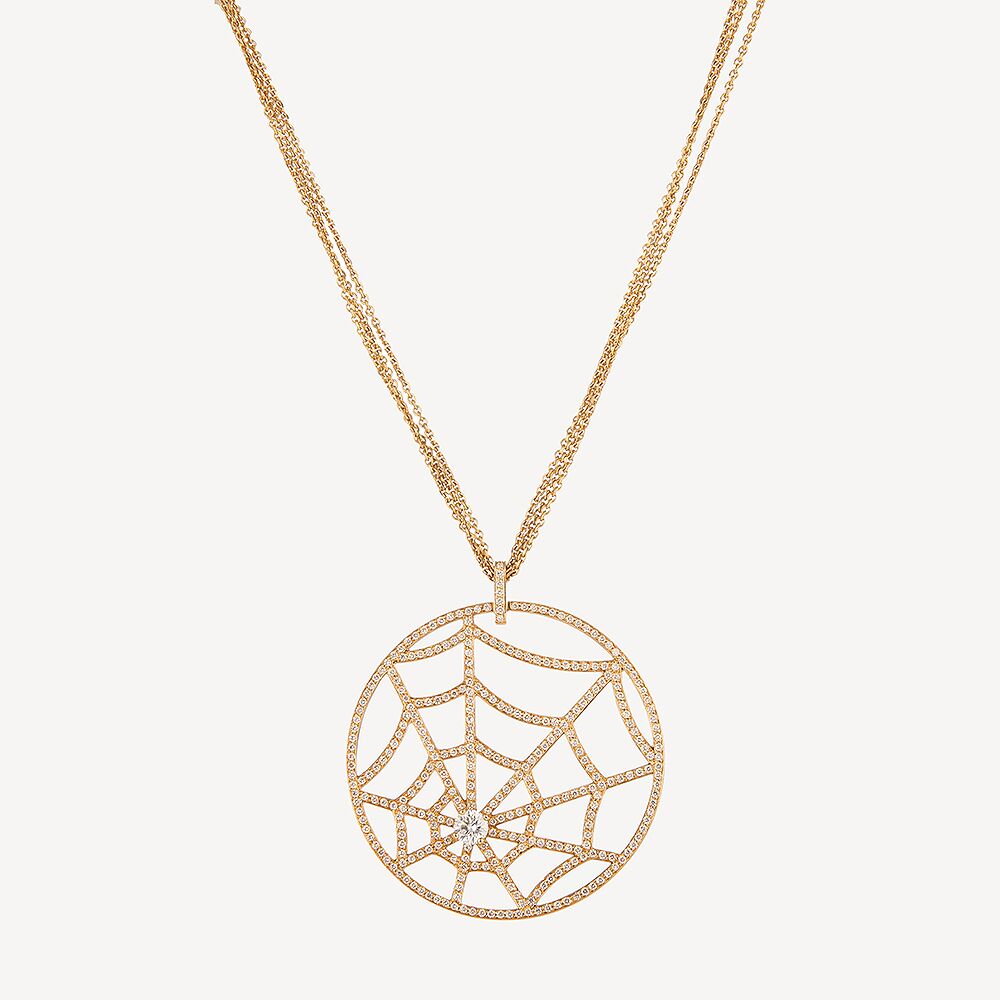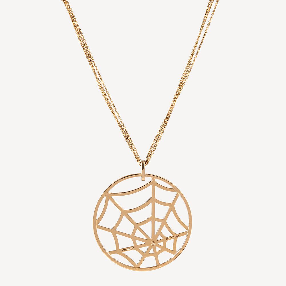 Collier Chaumet « Attrape moi si tu m’aimes » preśentant un motif circulaire figurant une toile d’araignée entiérement orné de diamants dont un plus important au centre, agrementé d’une fine bélière fixe sertie de diamants, retenue par une triple chaîne maille forçat en or jaune.