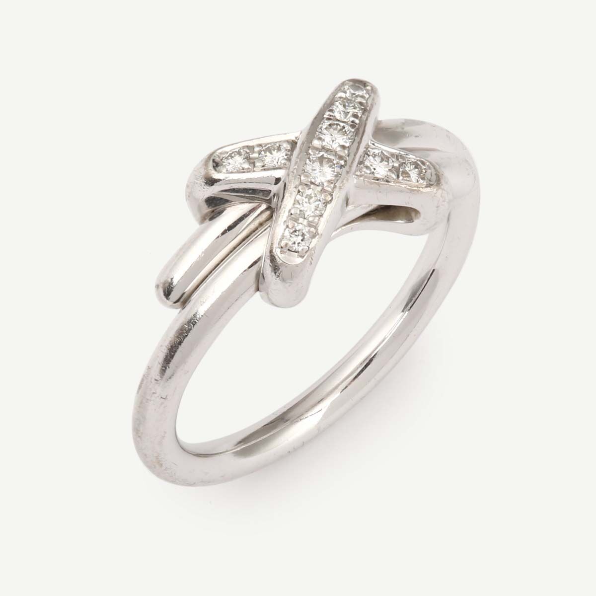 Bague Jeux de Lien Chaumet de seconde main en or blanc 18 carats (750/1000) : un anneau en or blanc, et 2 liens croisés délicatement pavés de diamants.