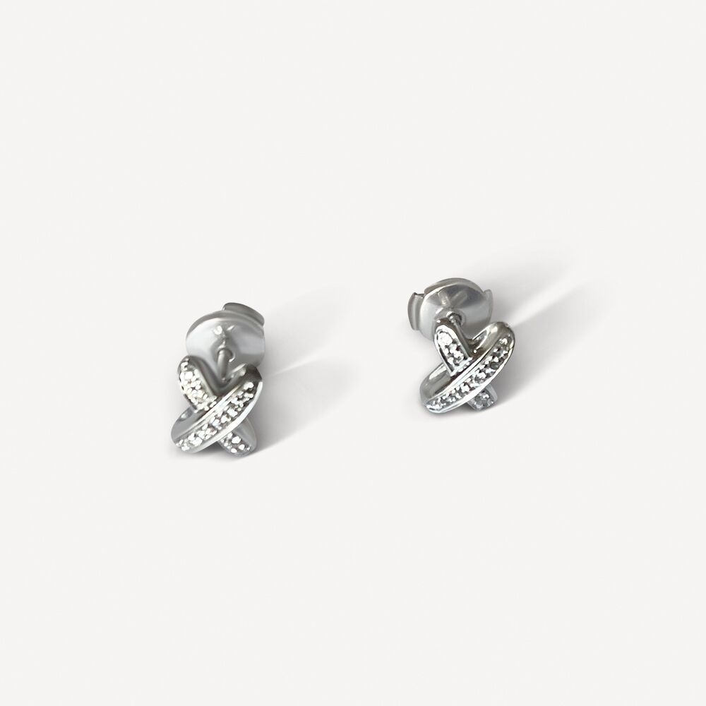 Puces d’Oreilles Premiers Liens Chaumet d’occasion en or blanc 750/1000 (18K). Chaque puce d’oreilles présente un motif fait de deux liens entrecroisés, sertis de 10 diamants taille brillant. Taille motif : 9 x 7 mm. Bijou Chaumet signé.