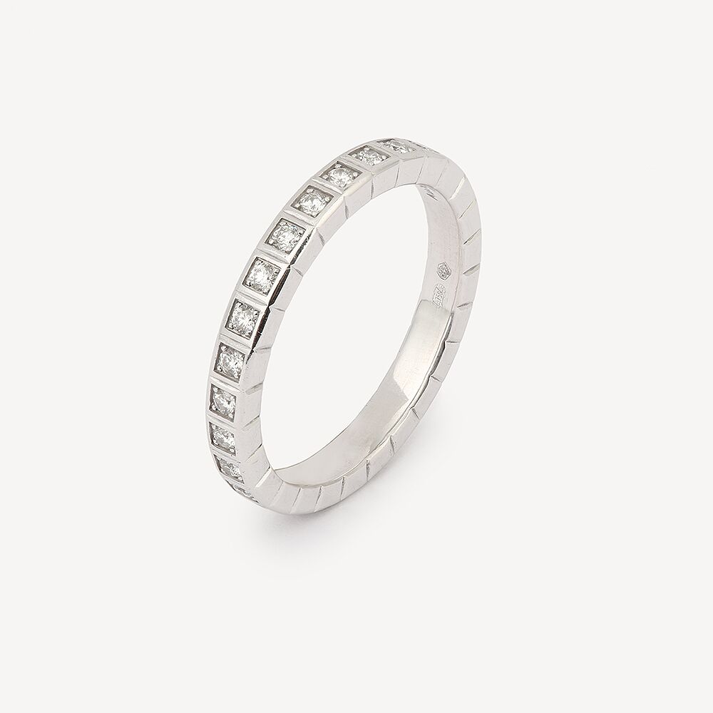 Bague Ice Cube Chopard d’occasion en Or Blanc 750/1000 (18K) et Diamant. La bague présente une succession de petits cubes sertis de diamants taille brillant. Tour de doigt : 50. Bijou Chopard signé et authentifié.