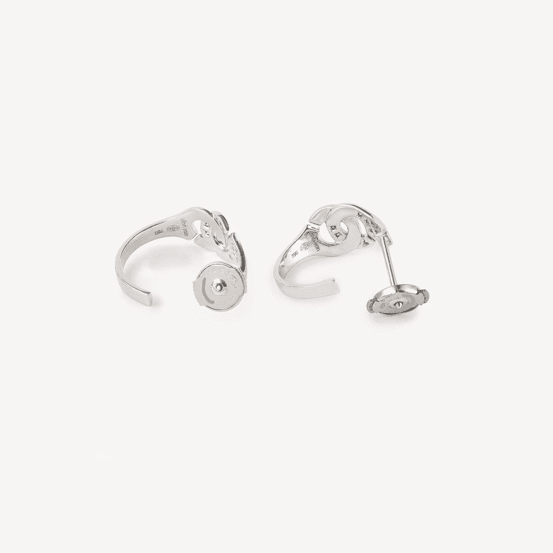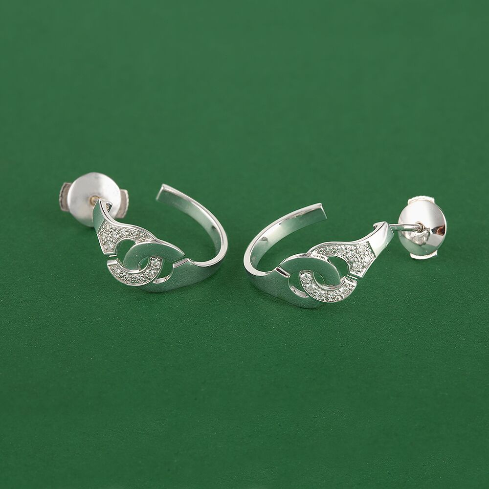 Boucles d’oreilles Menottes Dinh Van R7 d’occasion en or blanc 750/1000 (18K). Chaque boucle est une petite Créole partiellement pavée de diamants, sur l’une des deux menottes entrelacées. La paire présente une tige avec un système alpa. Bijou d’occasion Dinh Van signé pour oreilles percées.