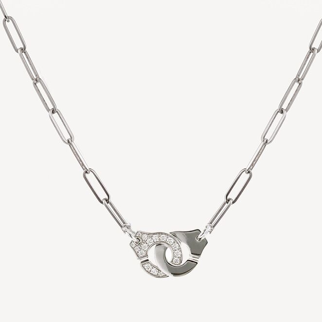 Collier Menottes Dinh Van de seconde main en or blanc 750/1000 (18K) : un motif de paire de menottes de 10 mm faisant office de fermoir, sur une chaîne maille cheval en or blanc.
