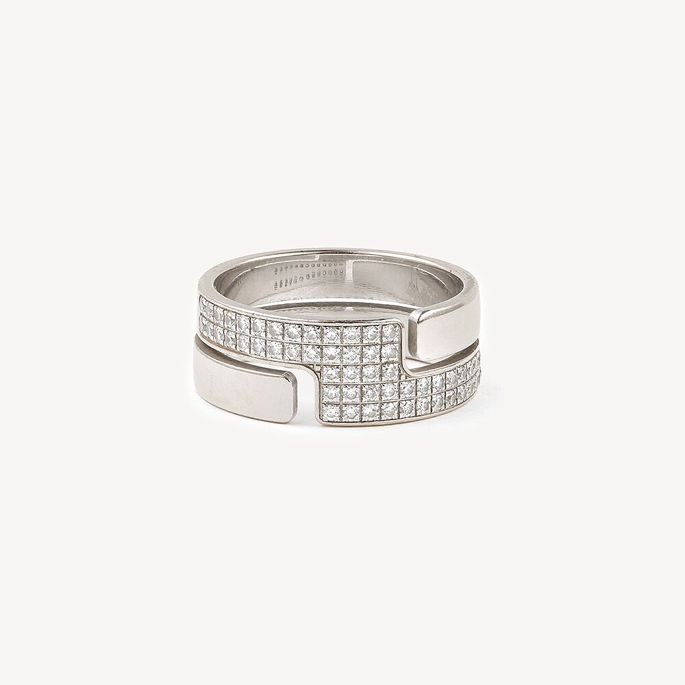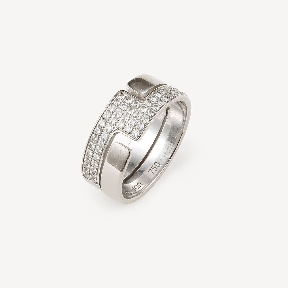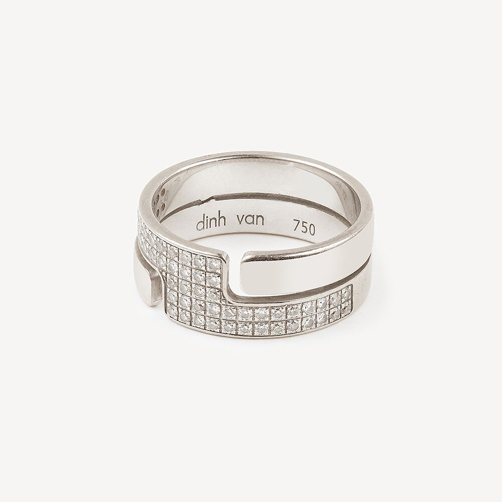 Bague Seventies Moyen Modèle Dinh Van d’occasion en or blanc 750/1000 (18 K). Un jonc plat qui présente un large anneau ajouré fait de deux anneaux plus fins, l’un étant partiellement pavé de diamants.