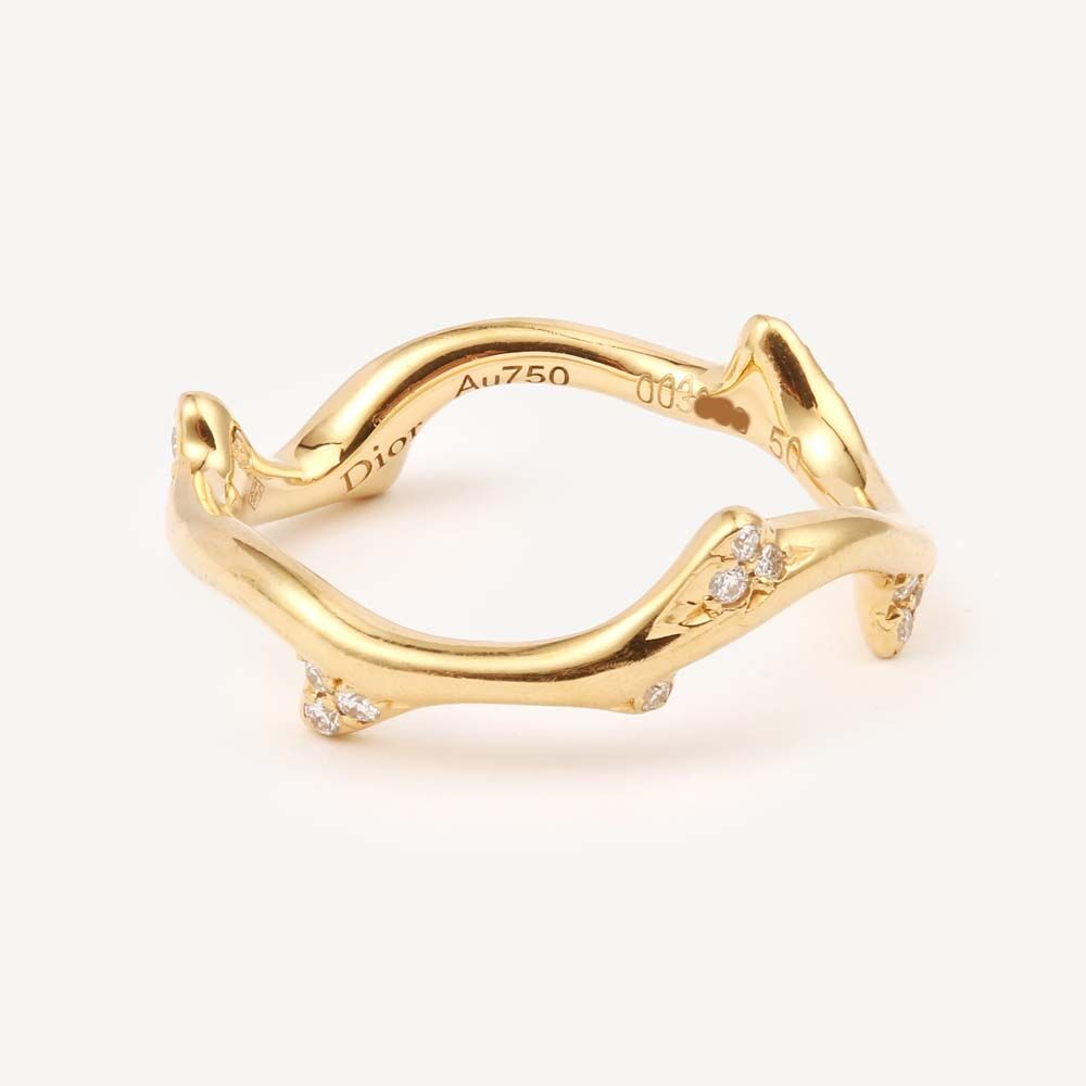 Bague Bois de Rose Dior de seconde main en or jaune 750/1000 (18K). Un anneau fin au contour irrégulier représentant la tige d’une rose avec 6 « épines » dont chaque pointe est ornée de 3 petits diamants, taille brillant, positionnés en triangle.
