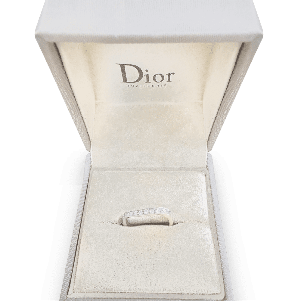 Alliance Couture Petit Tralala pavée de diamants Dior d’occasion en Or Blanc 750/1000 (18K) et Diamant. Cette bague présente un design délicat avec un anneau pavé de diamants étincelants, avec un détail de ruban. Tour de doigt 49. Bijou Dior signé et numéroté.