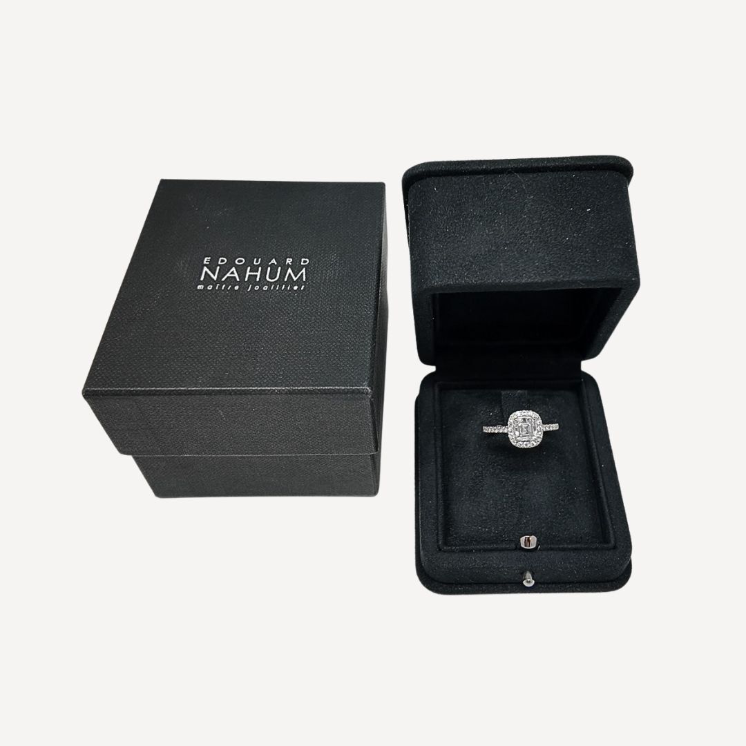 Bague Solitaire coussin Samantha Edouard Nahum d’occasion en or blanc 750/1000 sertie de diamants blanc taille brillant , et d’un diamant taille coussin. Ce solitaire Edouard nahum n’a jamais été porté.