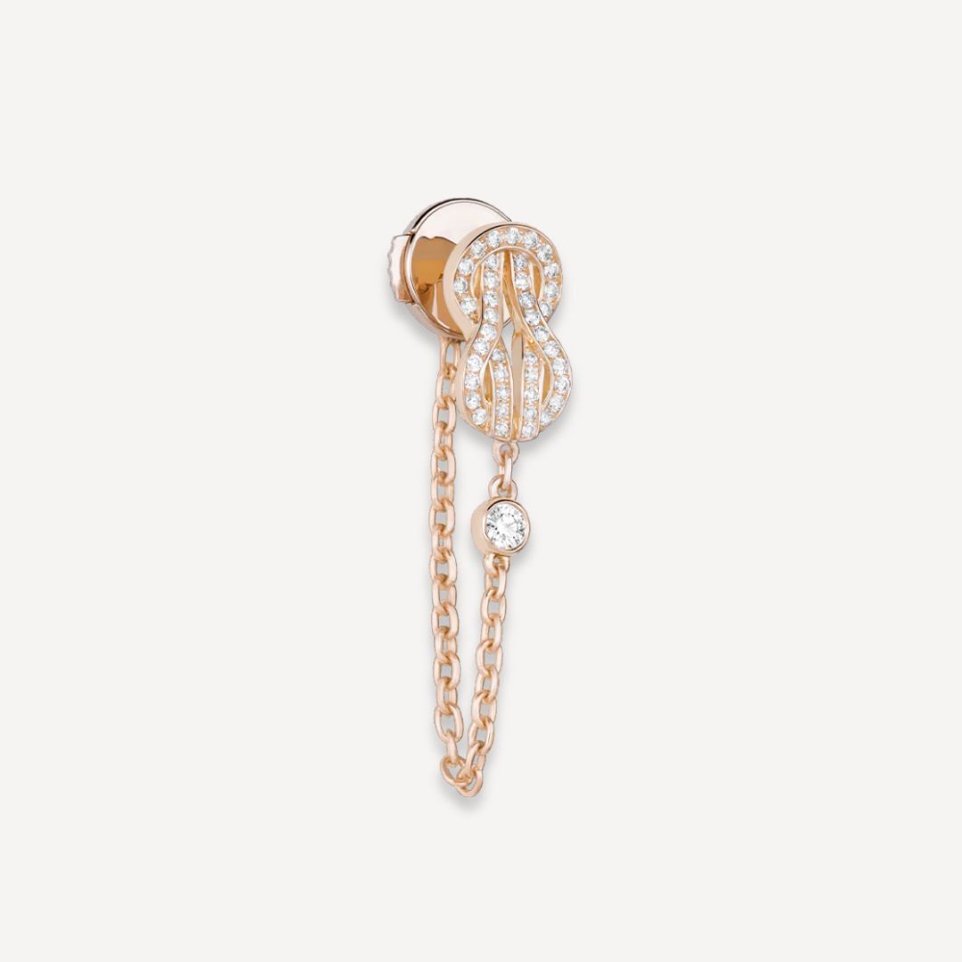 Boucles d’Oreilles Chance Infinie Fred d’occasion en or rose 750/1000 (18K). Les boucles d’oreilles présentent le motif emblématique de l’infini, caractérisé par deux courbes entrelacées formant un huit horizontal. La puce est reliée à l’attache (à l’arrière de l’oreille) par une fine chaîne, donnant une allure résolument moderne au bijou. La monture en or rose met en valeur la forme fluide et contemporaine du bijou. Longueur du motif : 11 mm. Largeur du motif : 6 mm. Bijou Fred signé.