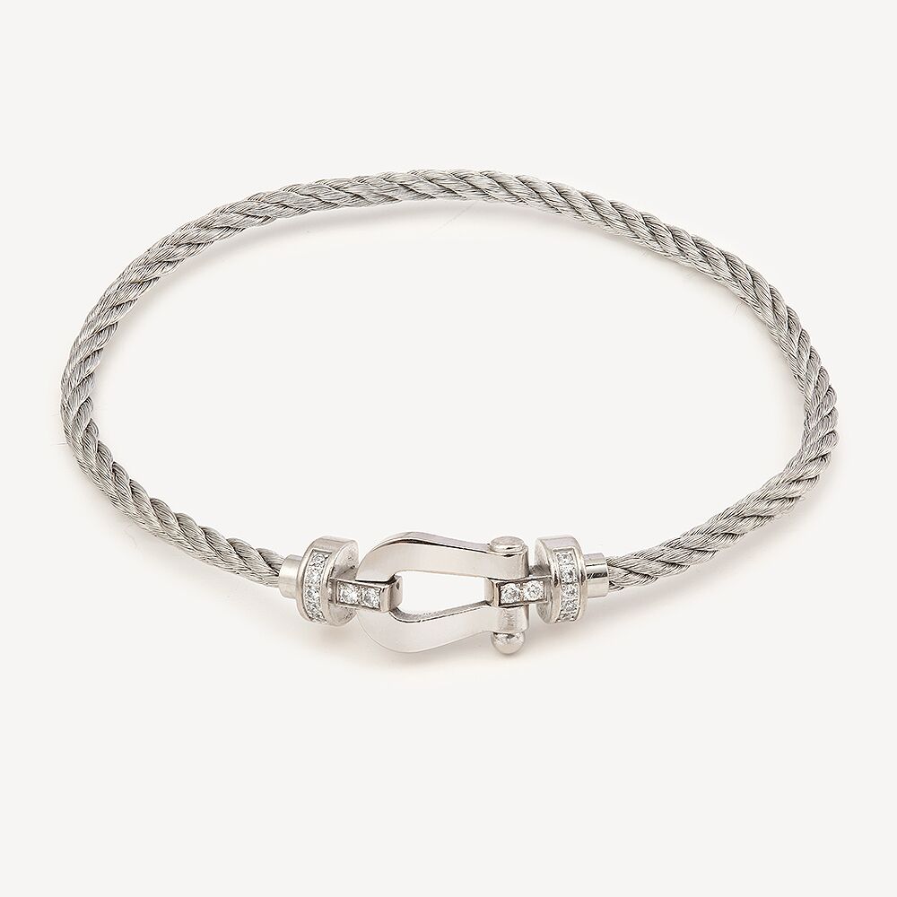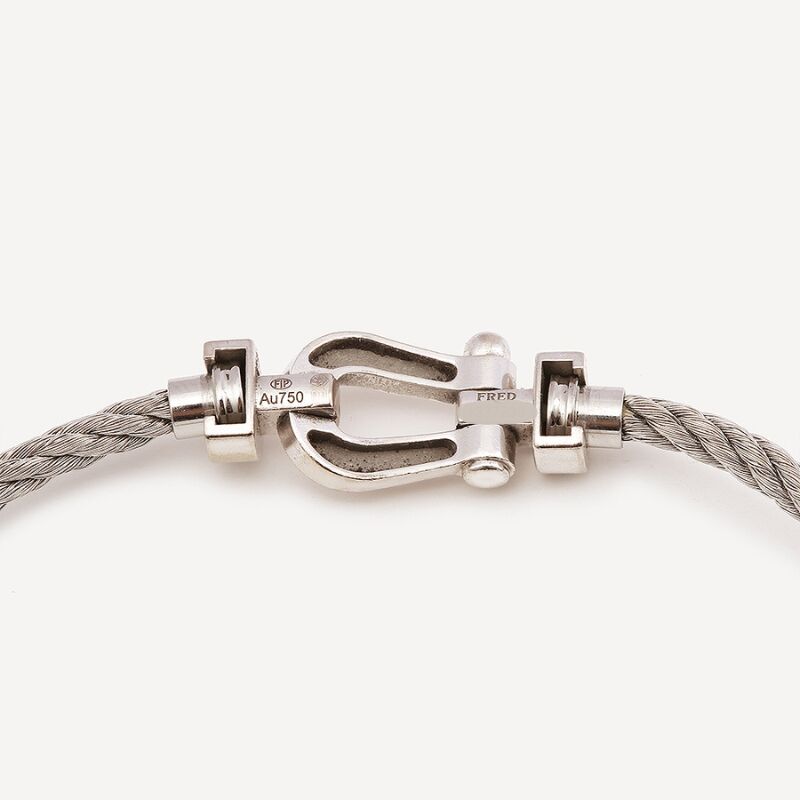 Bracelet Force 10 MM Fred d’occasion en or blanc 750/1000 (18K). Le bracelet présente un motif de manille en or blanc partiellement serti de diamants au niveau des extrémités, qui fait office de fermoir. Le motif est monté sur un câble marin en acier tressé. La manille mesure environ 2 cm de longueur et 1 cm de largeur. Il s’agit du bracelet de taille Moyen Modèle. Signé Fred et numéroté.
