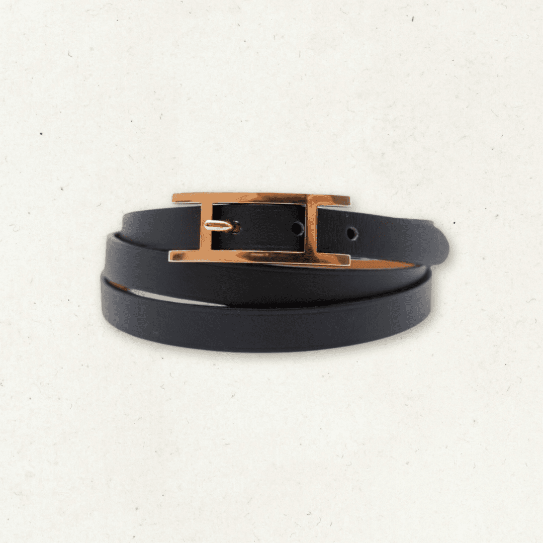 Bracelet Behapi Triple Tour Hermès de seconde main en cuir noir et Palladium, avec l’emblématique fermoir H Hermès attribué aux ceintures.