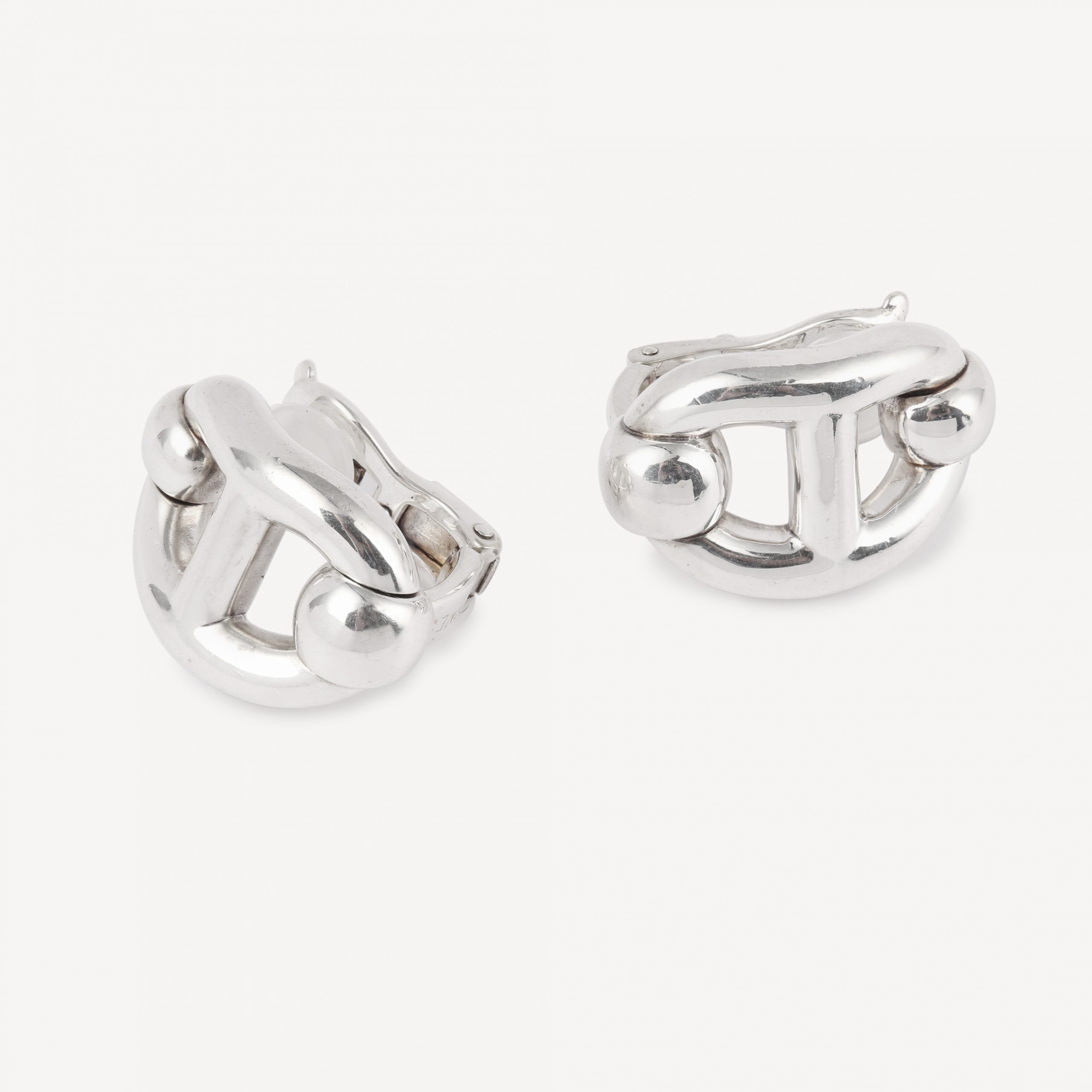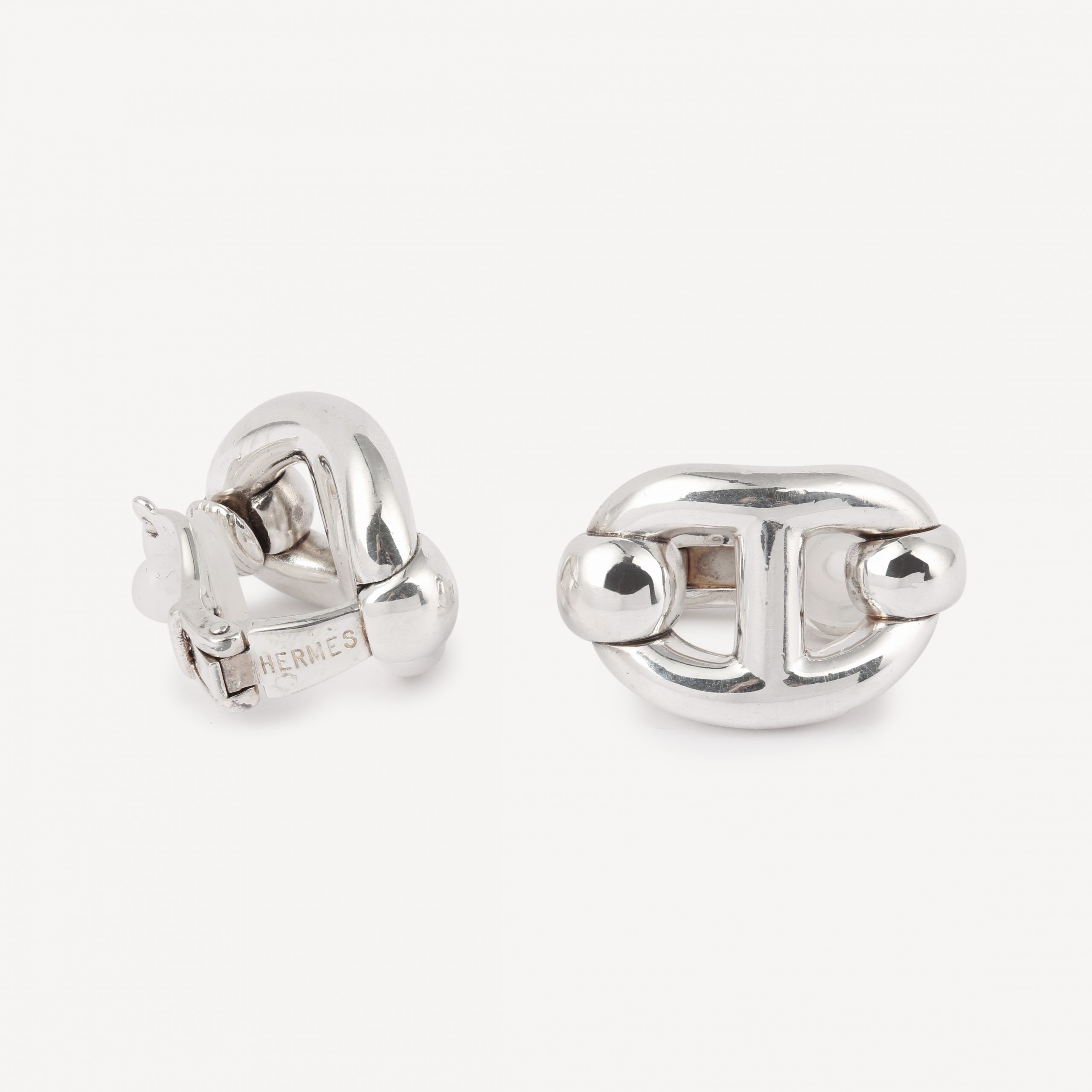Paire de boucles d’oreilles Chaîne d’Ancre Hermes d’occasion en argent 925, présentant un maillon de la célèbre chaîne d’ancre de la maison Hermès. Le maillon est légèrement bombé, un système clip permet de la fixer.