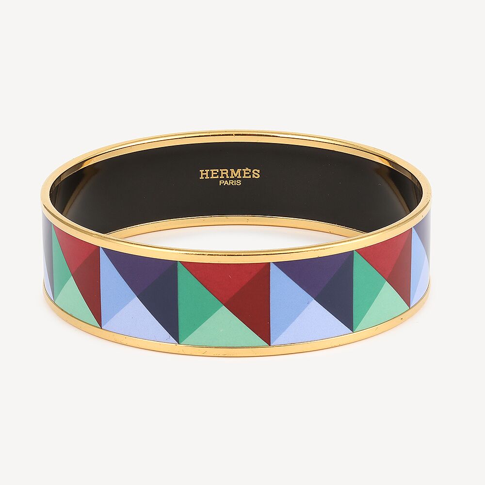 Bracelet Jonc Hermès Email d’occasion. Bracelet large, en émail, finition dorée avec des motifs géometriques de couleurs. La largeur du bracelet est d’environ 20 mm. Diamètre 7 cm. Modèle emblématique de la maison Hermès.