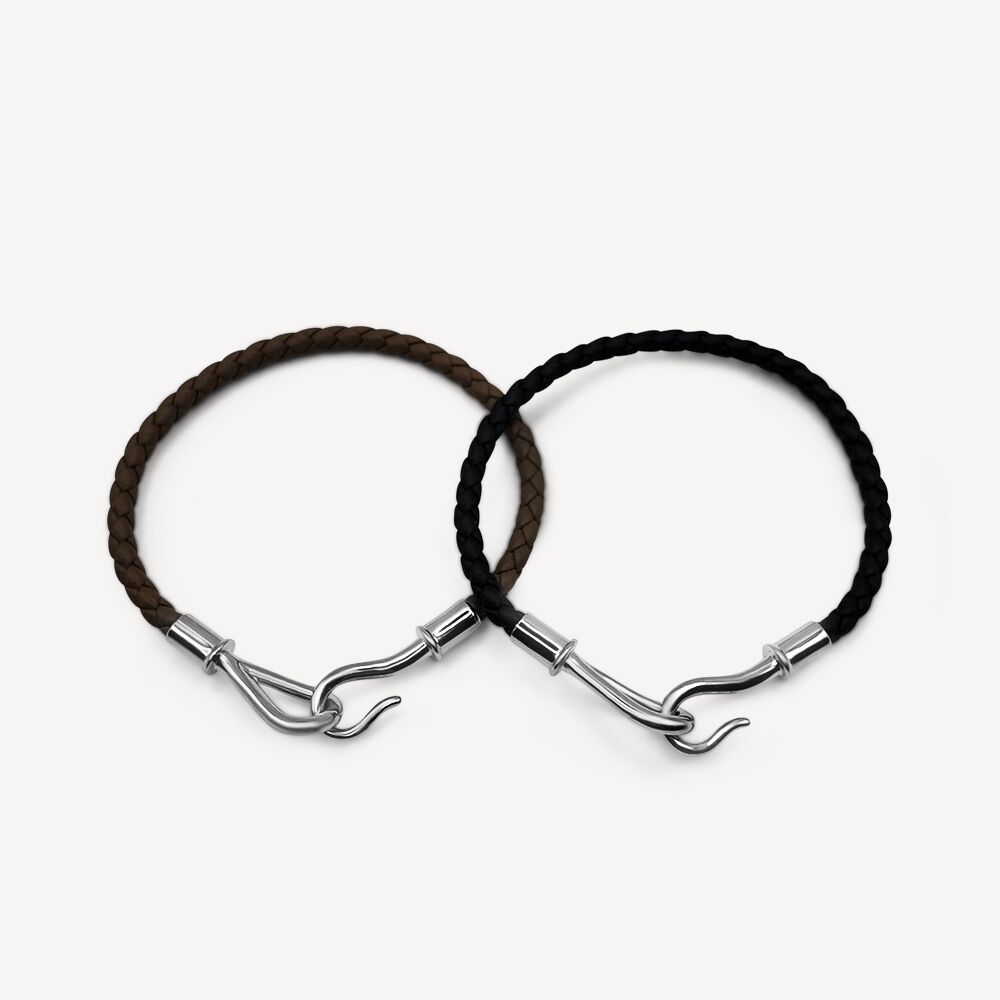 Set de 2 Bracelet Jumbo H Hermes d’occasion en Palladium. Chaque bracelet se compose d’un cordon en cuir tressé, terminé par un fermoir figurant un hameçon en métal, caractéristique de la collection Jumbo H. Ce fermoir, signature de la maison Hermès, se décline ici en version miniature. Bijou Hermes signé.
