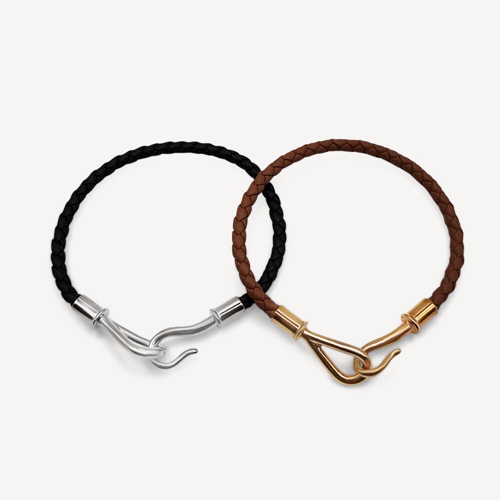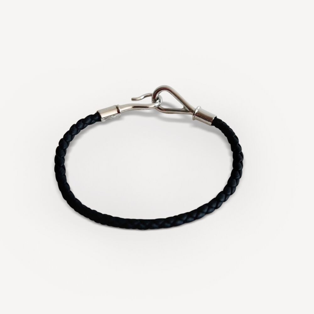 Set de 2 Bracelet Jumbo H Hermes d’occasion en Palladium. Chaque bracelet se compose d’un cordon en cuir tressé, terminé par un fermoir figurant un hameçon en métal, caractéristique de la collection Jumbo H. Ce fermoir, signature de la maison Hermès, se décline ici en version miniature. Bijou Hermes signé.