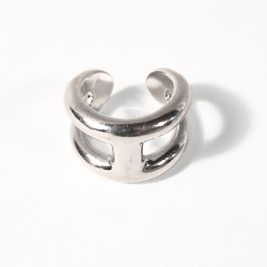 Bague Osmose GM Hermès d’occasion en argent 925/1000. Modèle d’une largeur de 1,6 cm, présentant une silhouette circulaire aux lignes épurées. Tour de doigt : X. Bijoux signé Hermès.