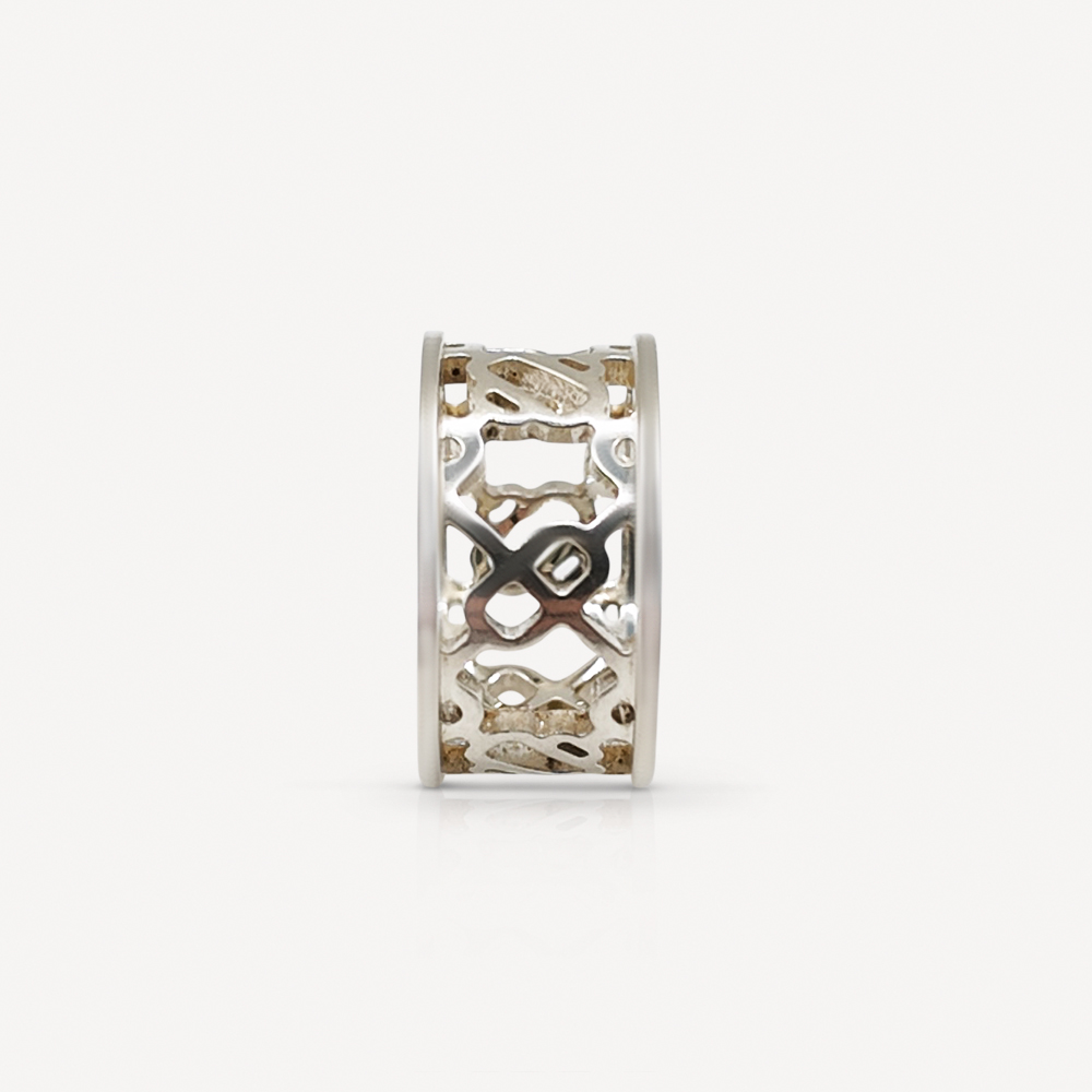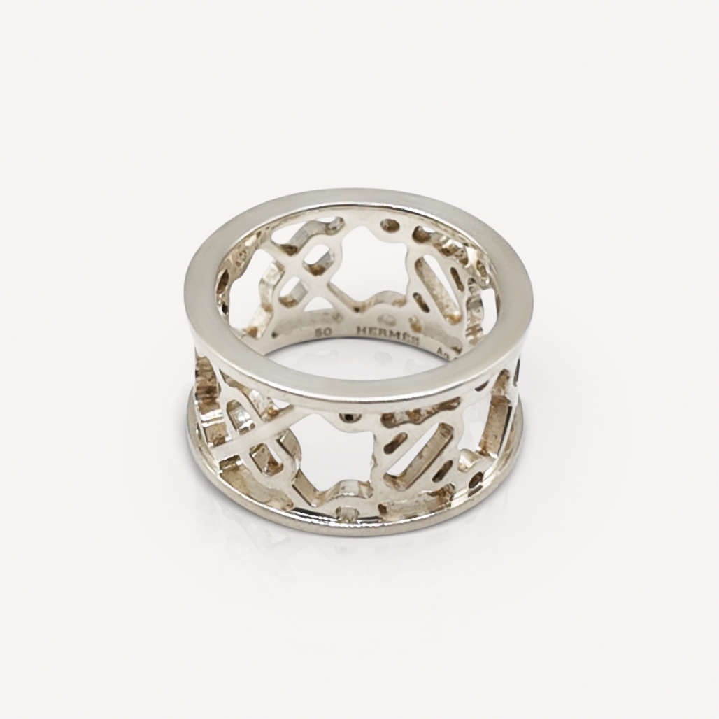 Bague Passerelle Hermès d’occasion en argent 925/1000. Ce modèle se distingue par sa structure ajourée composée de barrettes horizontales et verticales entrecroisées, inspirée de l’architecture et du design des ponts, d’où son nom. Tour de doigt : 50.