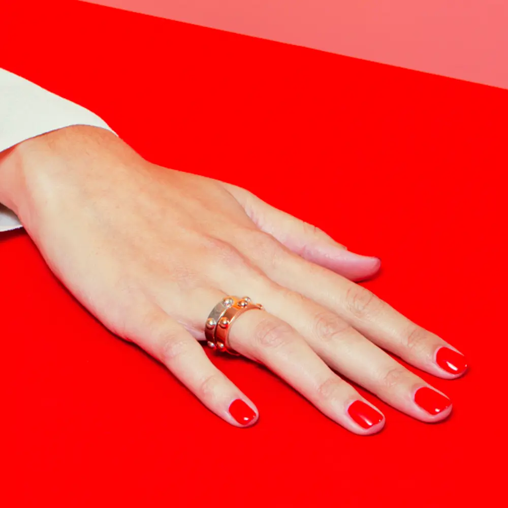 Marc Jacobs crée en 2001 pour Louis Vuitton sa première collection joaillère, et crée une série de bagues iconiques et intemporelles, où l’on reconnaît les symboles de la maison : des détails rappelant le savoir faire malletier. La bague Clou fait partie de cette série, on y reconnait les clous emblématiques des malles Louis Vuitton qui sont posés à la main sur les malles traditionnelles.