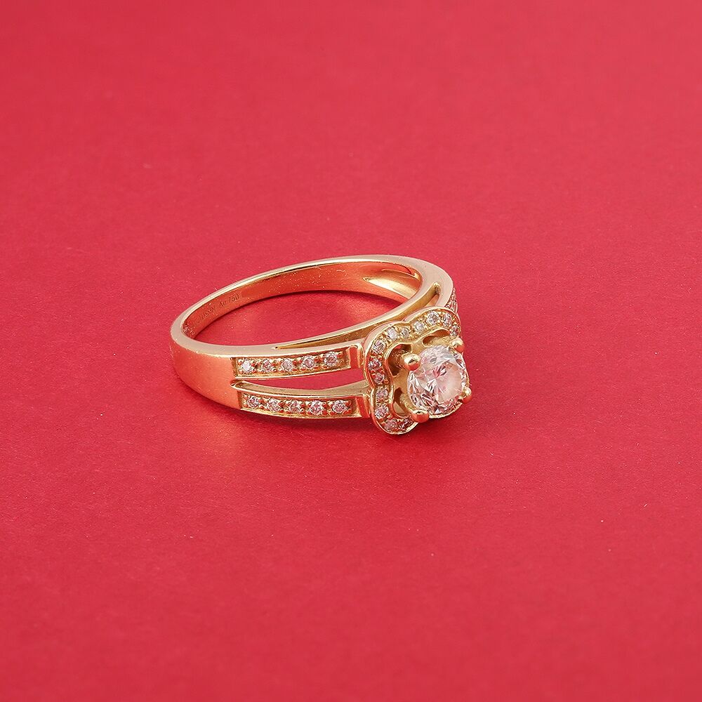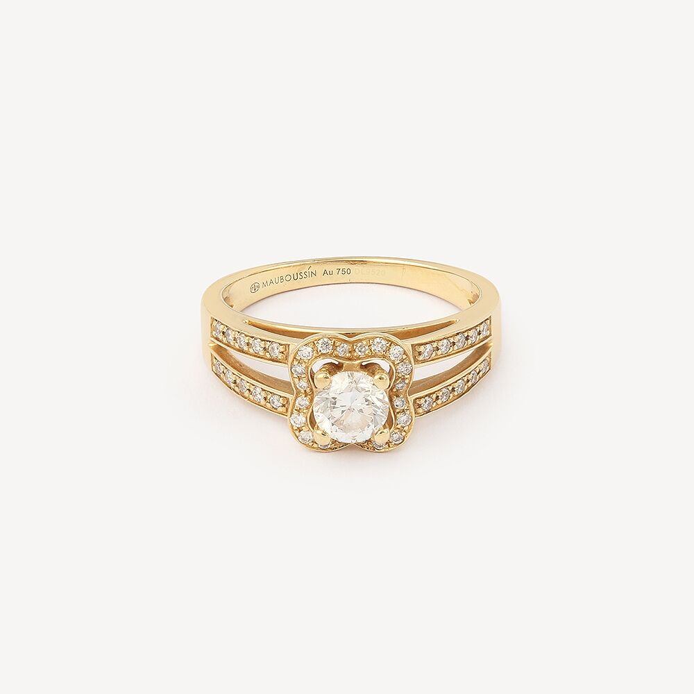 Bague Chance of Love N.5 Mauboussin de seconde main en or jaune 18 carats (750/1000). Un diamant central d’environt 0,5 carats entouré de petits diamants pour former un trèfle.