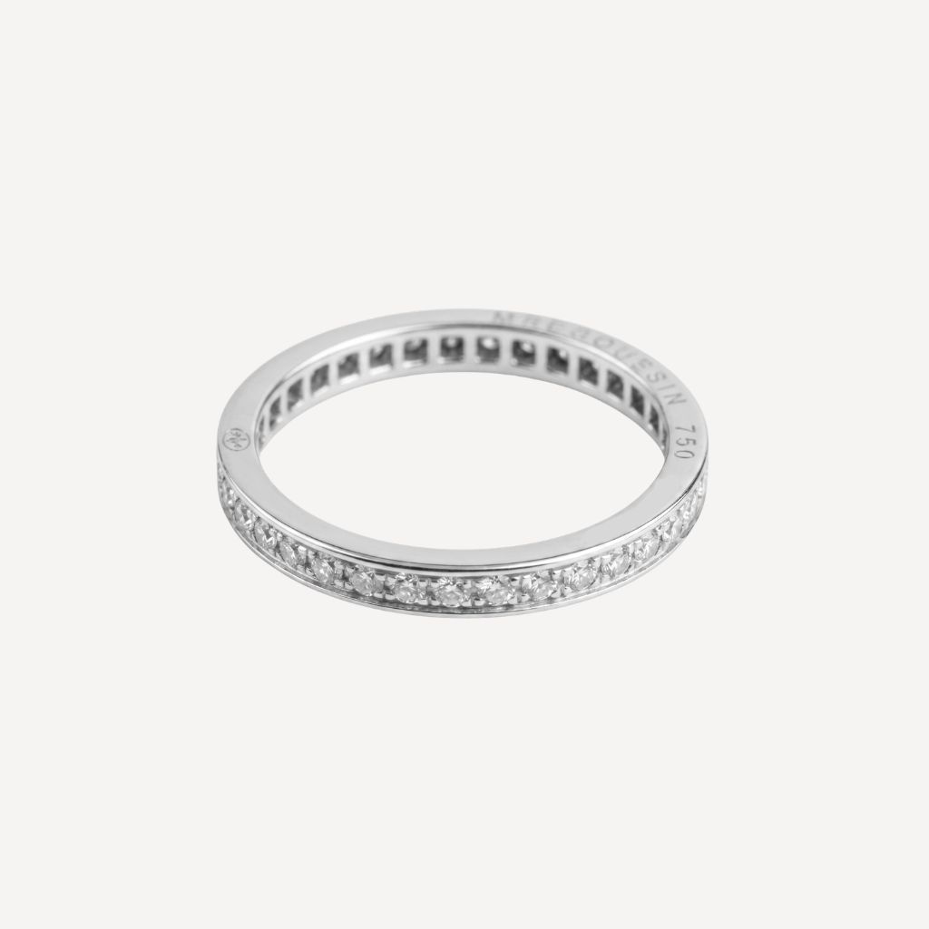 Alliance Diam’s Sex and Love Mauboussin en or blanc 750/1000 (18K) et diamants. Ce bijou présente un anneau au design épuré en or blanc, serti de diamants taille brillant sur tout le pourtour de l’anneau. Tour de doigt : 55. Bijou Mauboussin signé.