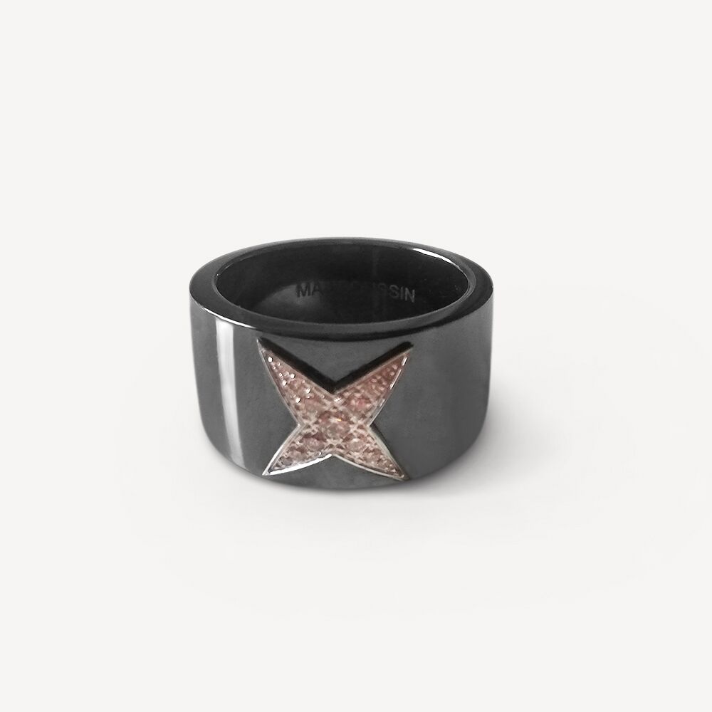 Bague Star Divine Mauboussin d’occasion en Titane noir, Or Blanc 750/1000 (18K) et Diamant. La bague présente un motif étoilé, serti de diamants taille brillants. Le design de la bague est moderne avec une étoile centrale en diamants et or blanc contrastant avec le titane noir . Tour de doigt : 50. Bijou Mauboussin signé et numéroté.