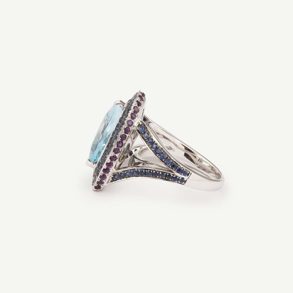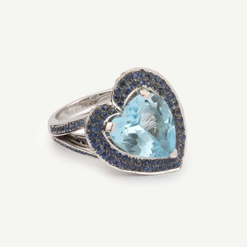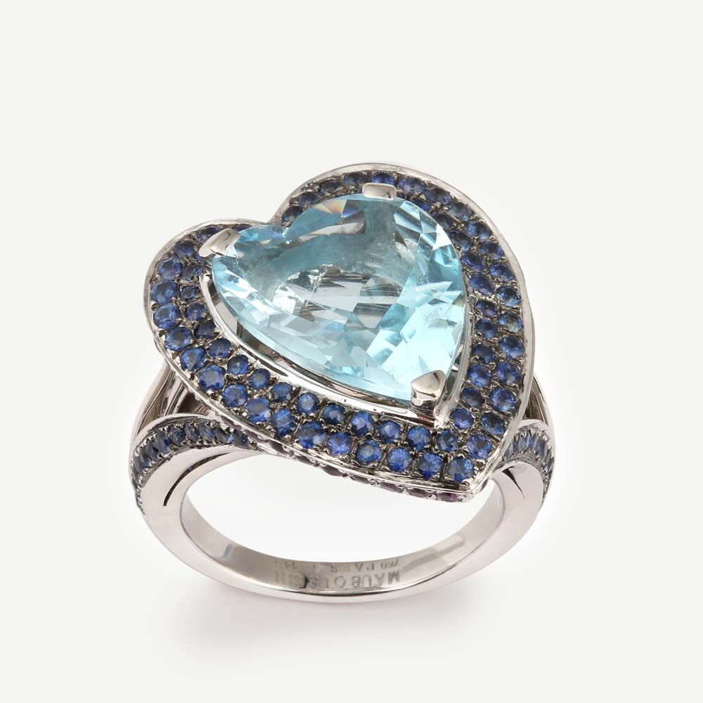 Bague Subtile Raison Mauboussin d’occasion en or blanc 750/1000 et topaze. La bague présente un motif de cœur légèrement incliné, orné en son centre d’une topaze bleue retenue par trois griffes, dans un double entourage de saphirs. Le corps de bague est partiellement serti de saphirs au niveau des doubles palmettes. De plus une rangée d’améthystes figure sur la tranche extérieure du cœur.