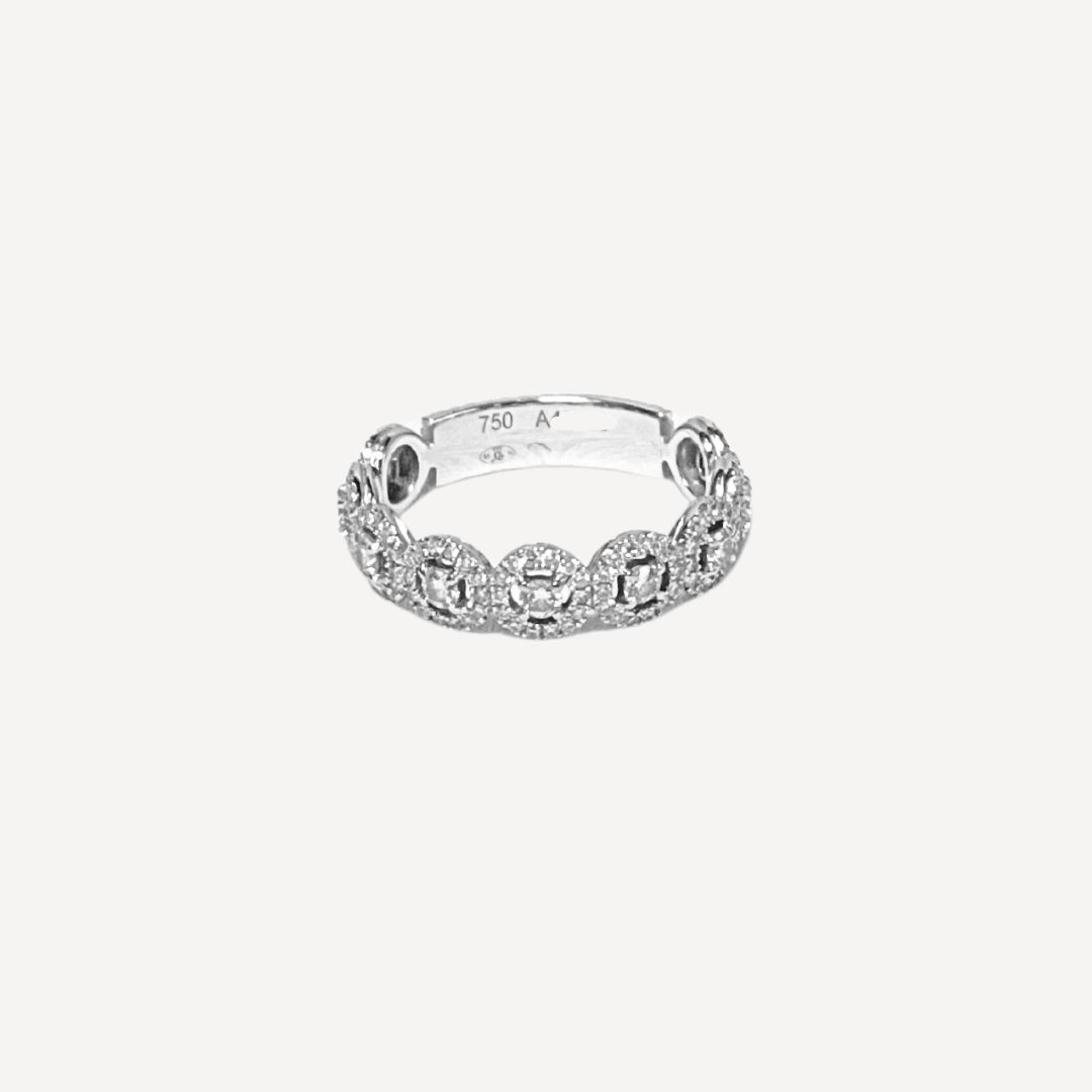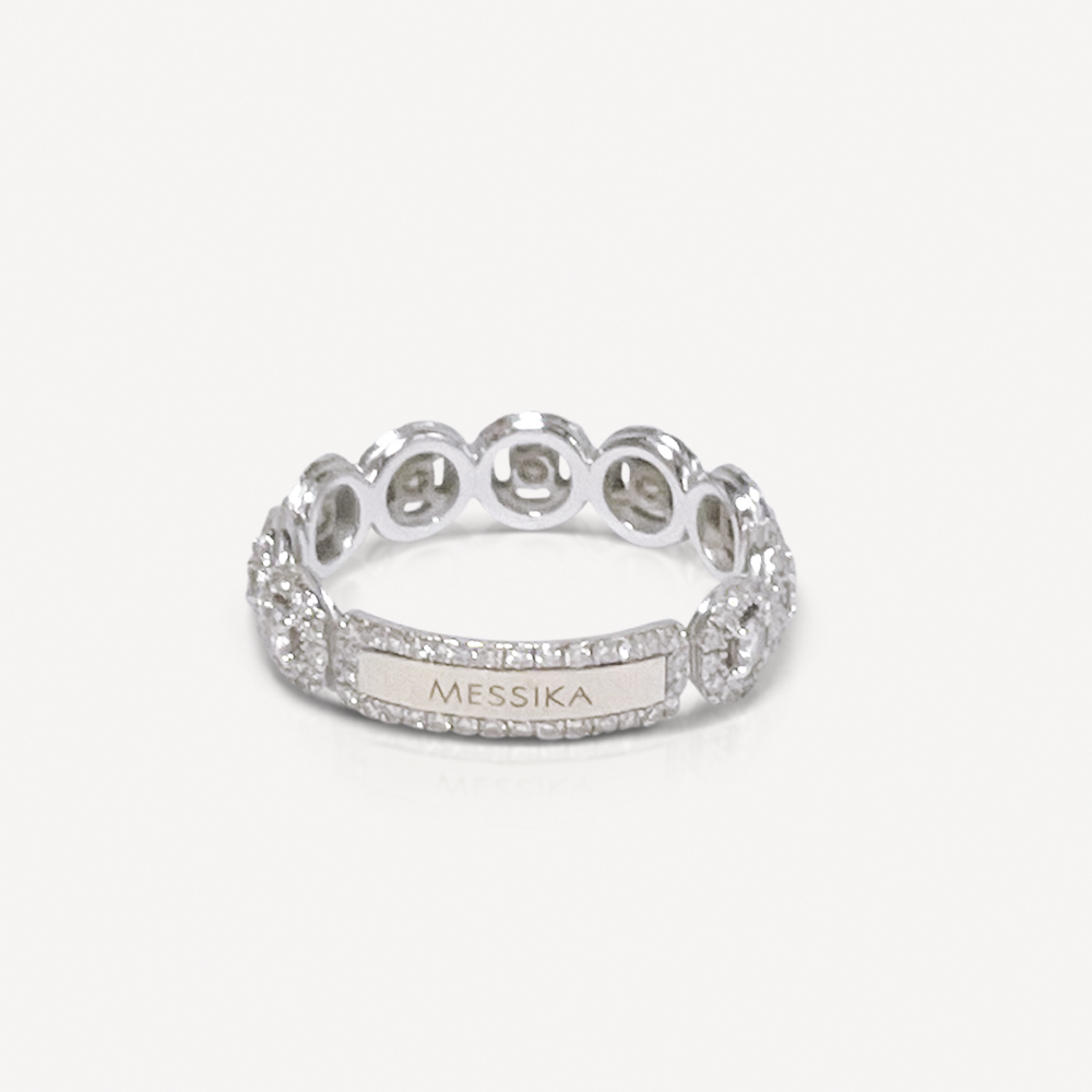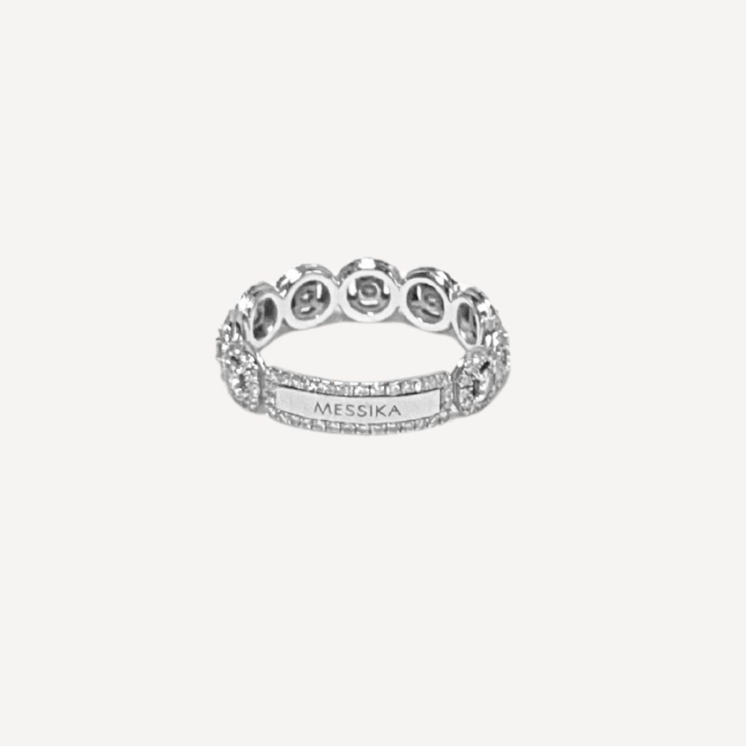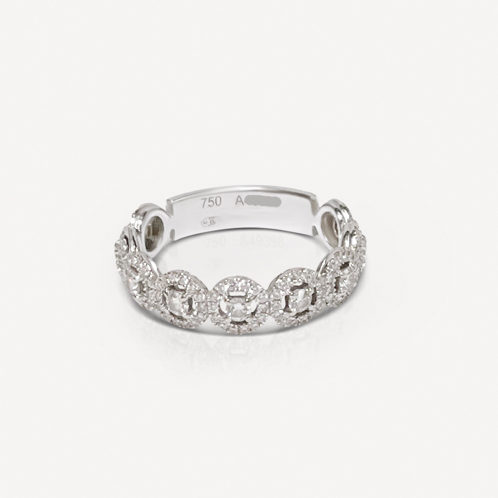 Alliance Joy tour complet Messika d’occasion en or blanc 750/1000 (18K). L’anneau est entièrement serti de 9 diamants chacun rehaussé d’un entourage de petits diamants taille brillants. A l’arrière, une plaque signée Messika complète le tour.