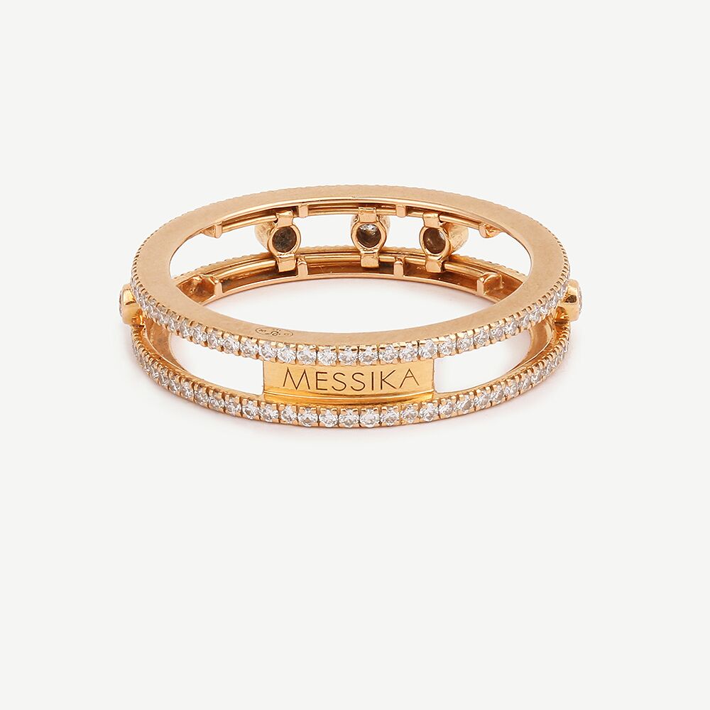 Bague Move Romane Messika d’occasion en or rose 750/1000 (18K). La bague présente 2 anneaux fins tout deux pavés de diamants, espacés de vide dans lequel 3 diamants sont en mouvement. Vendue avec sa boîte Messika.