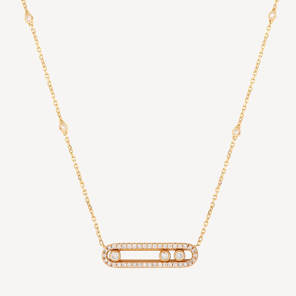 Collier Baby Move Messika d’occasion en or jaune 18 carats (750/1000). Une fine chaîne en or jaune avec un motif rectangle arrondi pavé de diamants, et en son centre trois diamants de taille brillant mobiles. Le motif mesurant 20 x 5 mm est monté sur une chaîne à maille forçat avec 4 diamants en serti clos de part et d’autre du motif (2 de chaque côté). La chaîne mesure environ 45 cm et comportant 5 anneaux de réglage. Bijou signé Messika.