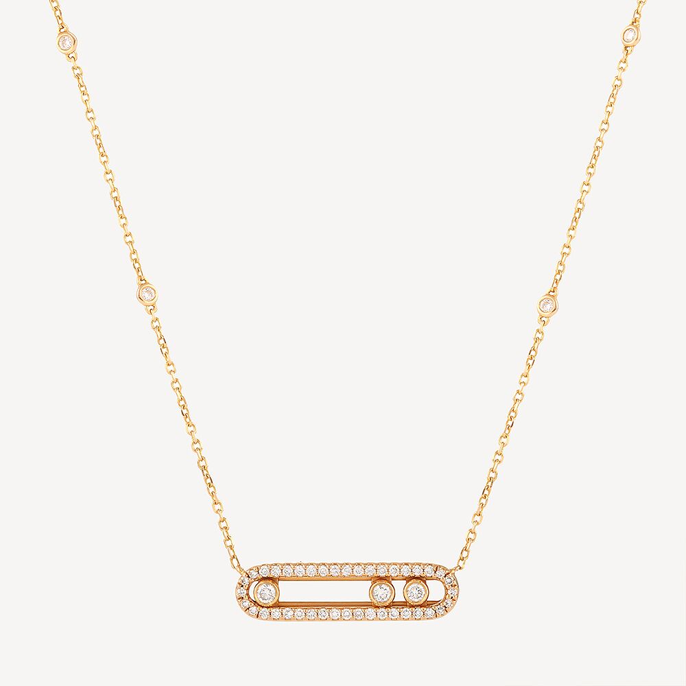 Collier Baby Move Messika d’occasion en or rose 750/1000 (18K). Une fine chaîne en or rose avec un motif rectangle arrondi pavé de diamants, et en son centre trois diamants de taille brillant mobiles. Le motif mesurant 20 x 5 mm est monté sur une chaîne à maille forçat avec 4 diamants en serti clos de part et d’autre du motif (2 de chaque côté). La chaine mesurant environ 40 cm et comportant 5 anneaux de réglage se ferme à l’aide d’un anneau ressort. Signature : Messika et numéroté.