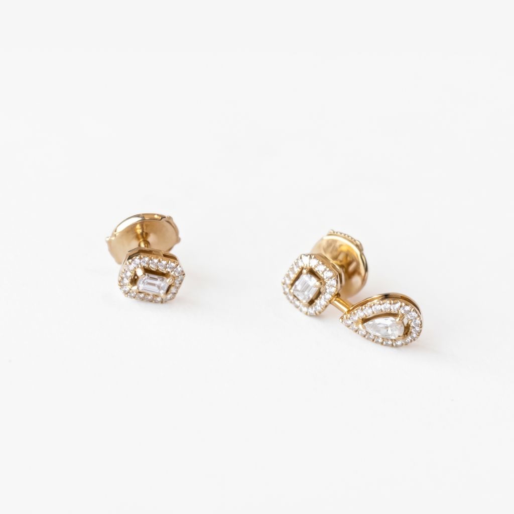 Boucles d’Oreilles My Twin Messika en or jaune 750/1000 (18K) et diamants. Un duo de puces d’oreilles dépareillées. L’une se compose d’un diamant taille émeraude entouré d’un pavage de diamants. L’autre présente une asymétrie avec le même motif, auquel est rattaché, grâce à une tige en or, un second diamant en forme de poire orné d’un halo de diamants également. Bijou signé Messika.