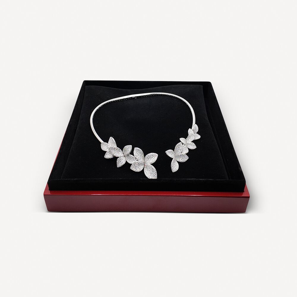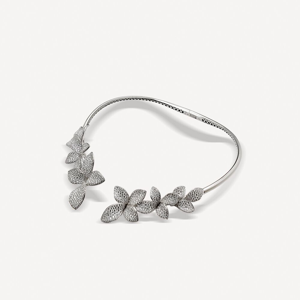 Collier Giardini Segreti Pasquale Bruni d’occasion, en or blanc 18 carats (750/1000). Le collier est orné de plusieurs motifs floraux sertie de diamants blancs finement travaillés.